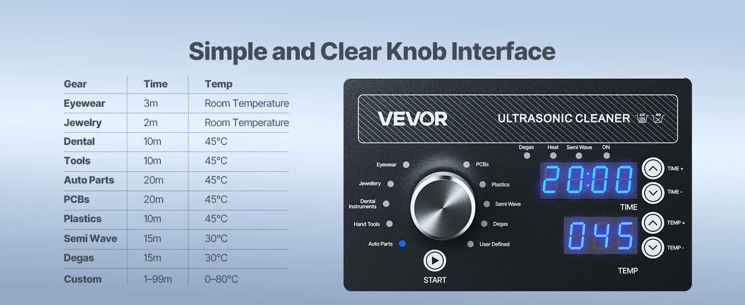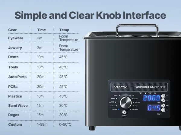 Gebruiksvriendelijk: Frequentie, tijd en temperatuur kunnen eenvoudig worden ingesteld met een draaiknop. Met onze ultrasone reiniger vindt u snel de ideale parameters voor sieraden, horloges en industriële onderdelen.