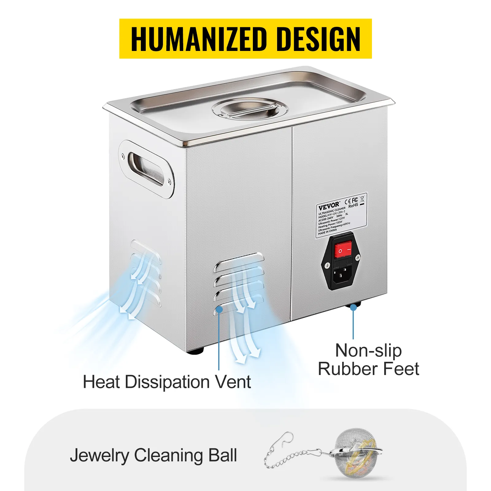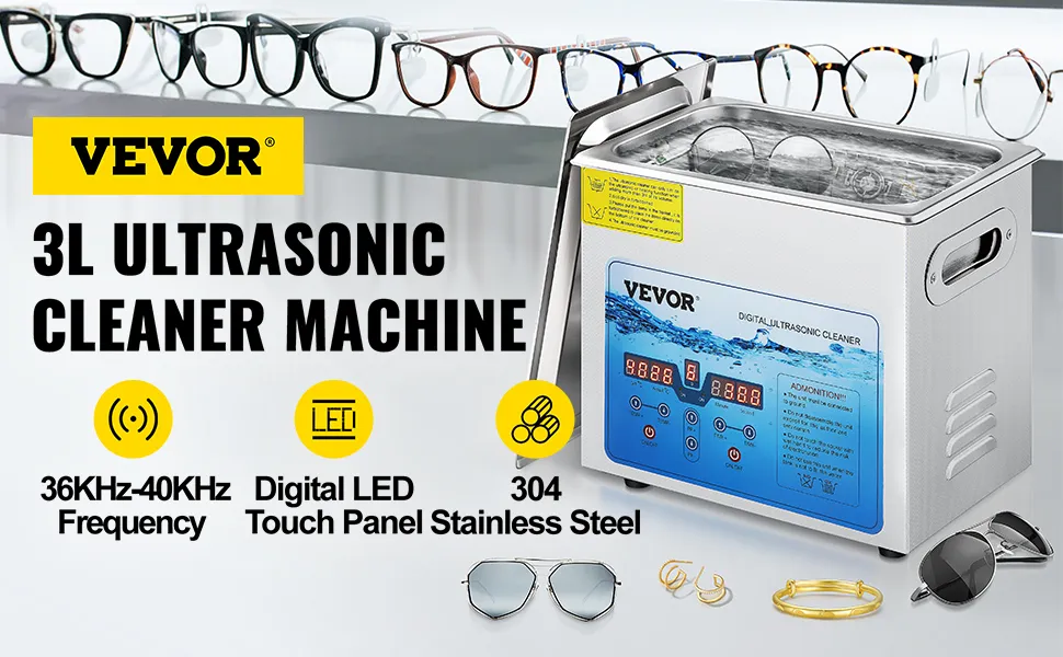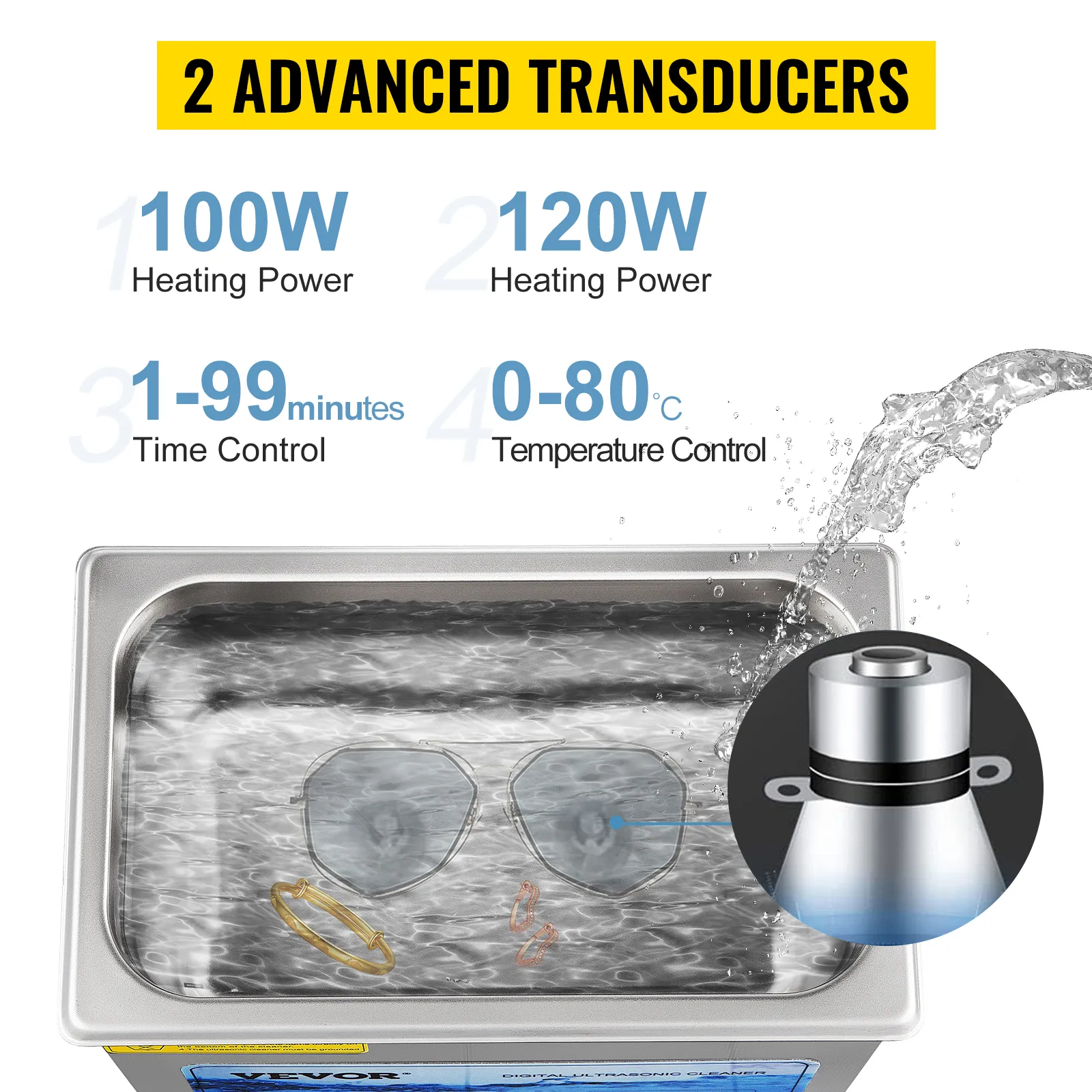 De sonische reinigers van de VEVOR hebben instelbare frequentie, tijd en temperatuur om aan uw verschillende reinigingsbehoeften te voldoen. Het premium 304 roestvrij staal en de complete accessoires zorgen voor een lange levensduur en maximaal comfort. Het ontwerp van de warmteafvoeropening en antislip rubberen voetjes zorgen ervoor dat de sieradenreinigingsmachine soepel en veilig werkt zonder enige schade. Bovendien kregen onze producten de FCC/CE/RoHS-certificaten. De professionele ultrasone sieradenreiniger is een optimale oplossing voor laboratorium, huis, handel, industrie, fabriek, enzovoort.