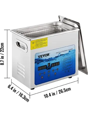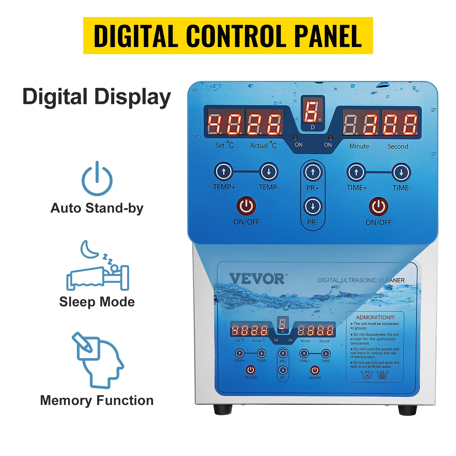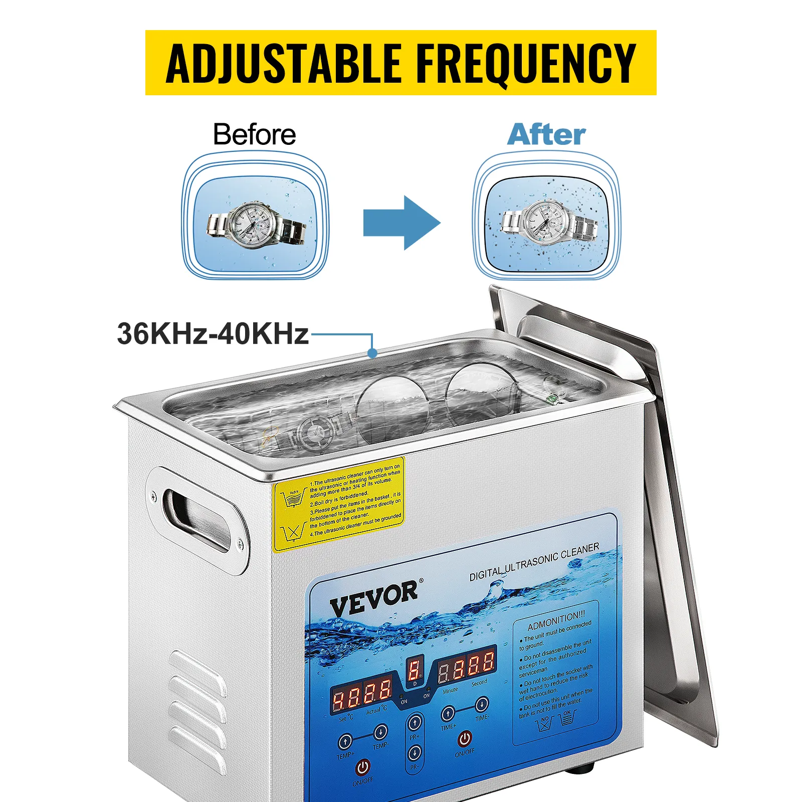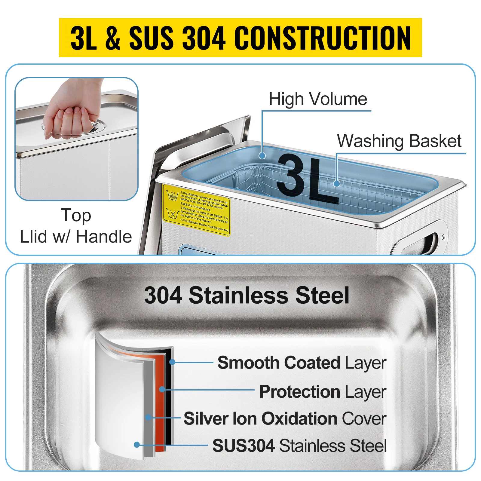 De sonische reinigers van de VEVOR hebben instelbare frequentie, tijd en temperatuur om aan uw verschillende reinigingsbehoeften te voldoen. Het premium 304 roestvrij staal en de complete accessoires zorgen voor een lange levensduur en maximaal comfort. Het ontwerp van de warmteafvoeropening en antislip rubberen voetjes zorgen ervoor dat de sieradenreinigingsmachine soepel en veilig werkt zonder enige schade. Bovendien kregen onze producten de FCC/CE/RoHS-certificaten. De professionele ultrasone sieradenreiniger is een optimale oplossing voor laboratorium, huis, handel, industrie, fabriek, enzovoort.