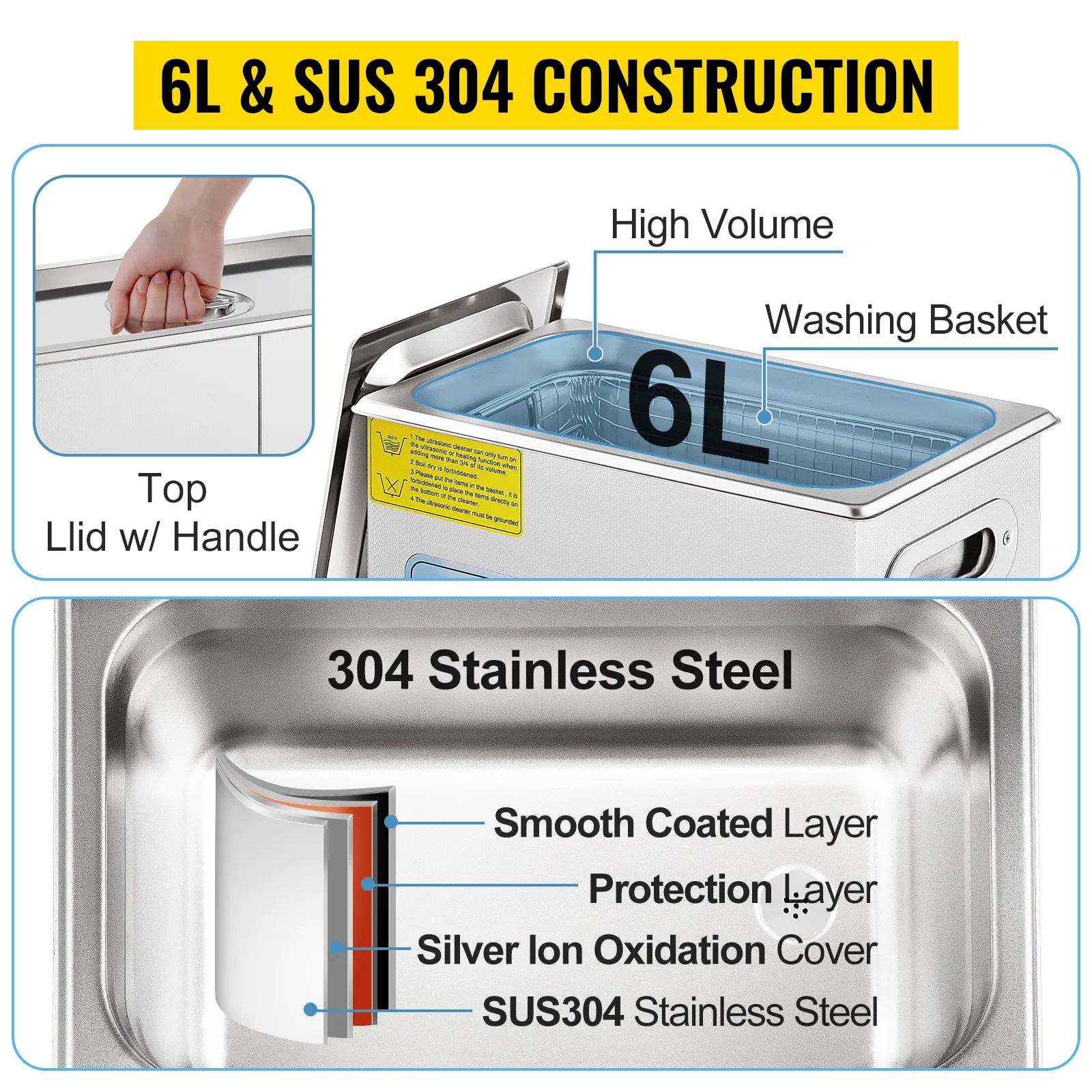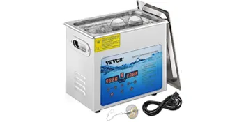 Deze ultrasone onderdelenreiniger is gemaakt van corrosiebescherming en roestvrij 304 roestvrij staal, duurzaam genoeg om jaren mee te gaan. De tank van 1,59 gal / 6 L is groot genoeg voor uw sieraden, brillen, horloges of kunstgebitten. Wordt geleverd met een geluiddempend bovendeksel en een wasmand voor het reinigen van voorwerpen die minder wrijving nodig hebben.