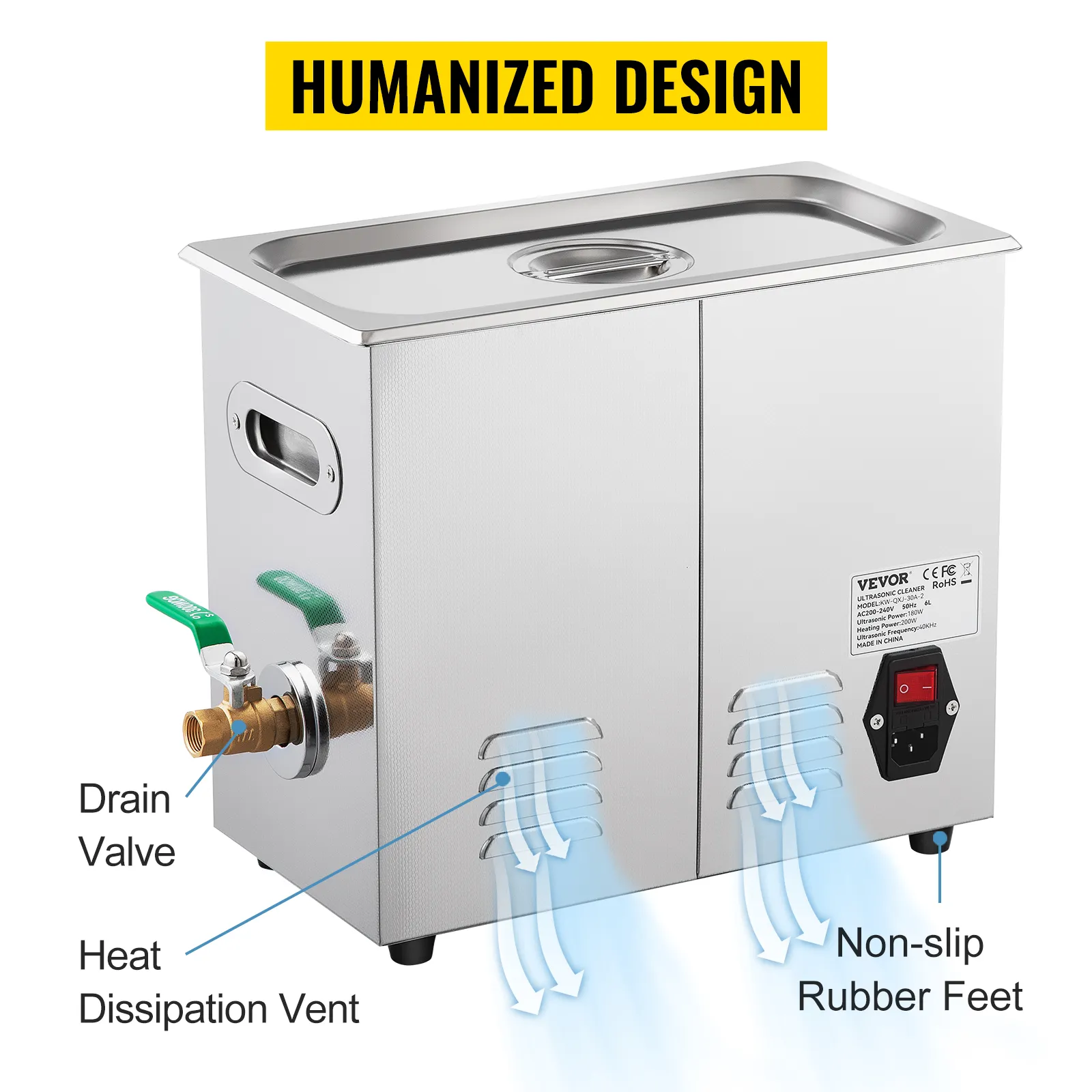De ultrasone kettingreiniger is ontworpen met warmteafvoeropeningen voor warmteafvoer, antislip rubberen voetjes en een afvoerklep helpt de waterafvoer, waardoor deze sieradenreiniger extreem veilig is tijdens het gebruik.