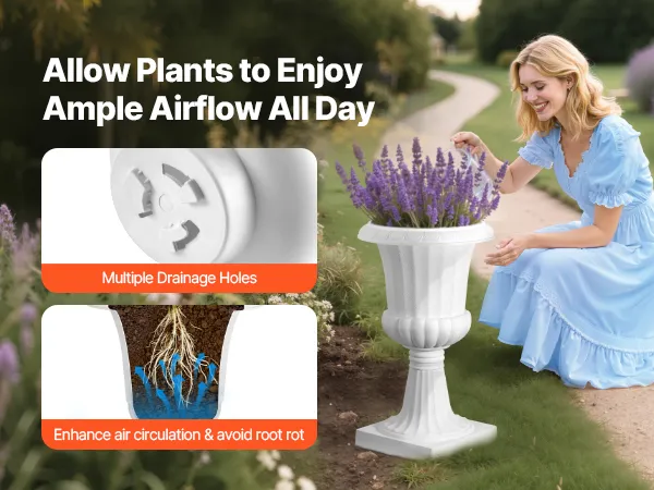 Dankzij de meerdere drainagegaten bevordert deze bloemenurn de luchtcirculatie en snelle waterafvoer, waardoor de wortels van uw planten de hele dag fris, gezond en bloeiend blijven.