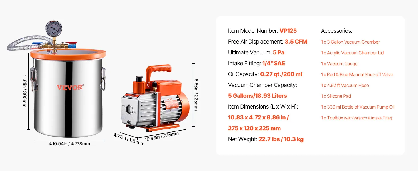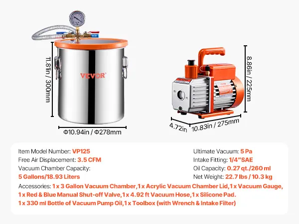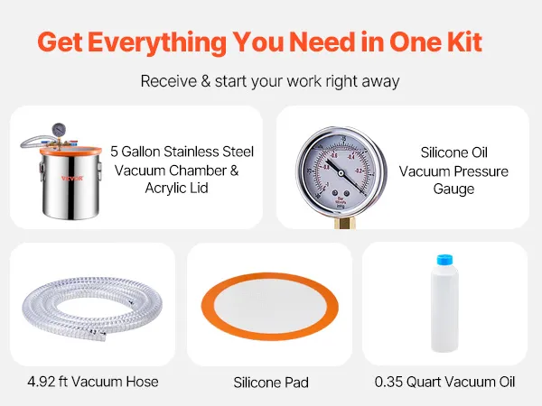 Everything You Need in One Kit: This vacuum chamber and pump kit comes with full accessories for seamless degassing! 1 x Single-stage Vacuum Pump, 1 x 5 Gallon Vacuum Chamber, 1 x Acrylic Vacuum Chamber Lid, 1 x Vacuum Gauge Set, 1 x Red & Blue Manual Shut-off Valve, 1 x 4.92 ft Vacuum Hose, 1 x Silicone Pad, and 1 x Bottle of 0.35 qt. (330 ml) Vacuum Pump Oil.