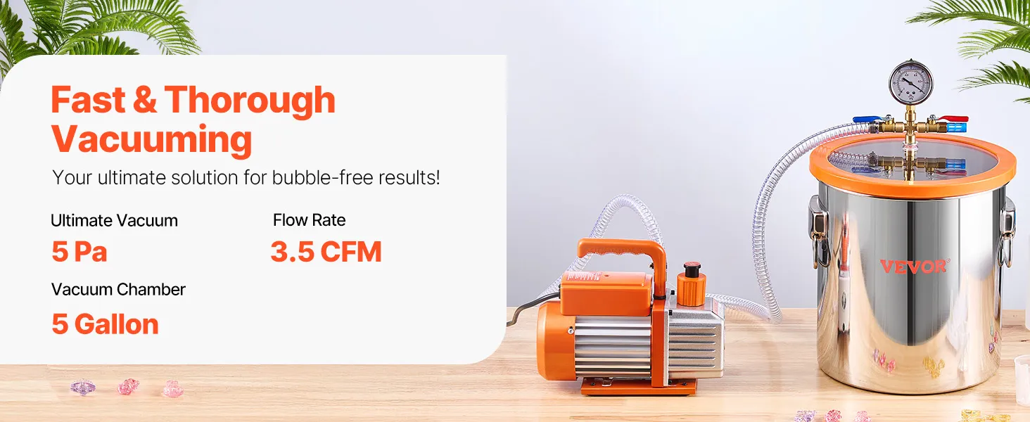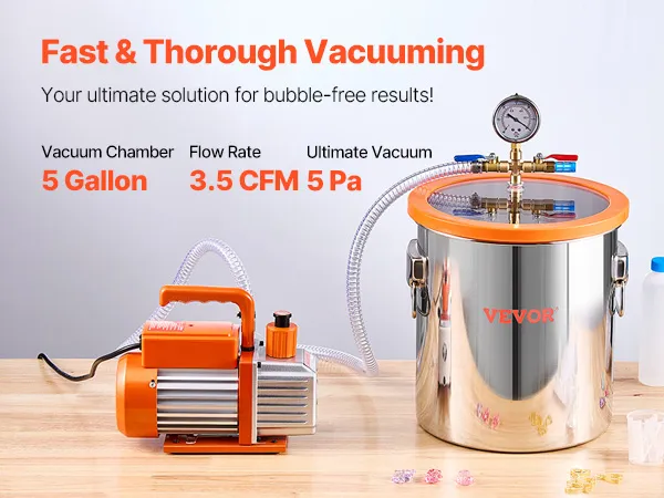 Efficient Degassing Performance: Our 3.5 CFM vacuum pump is engineered specifically for degassing and de-bubbling applications, achieving an impressive 5Pa ultimate vacuum. Whether you're working in a lab, handling food packaging, or resin casting, this pump ensures thorough air extraction, avoiding bubbles and enhancing reliability. (Note: This vacuum chamber with pump kit is not suitable for wood stabilization.)