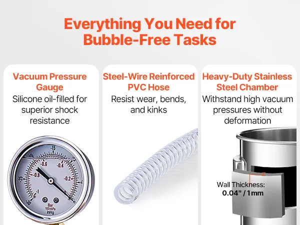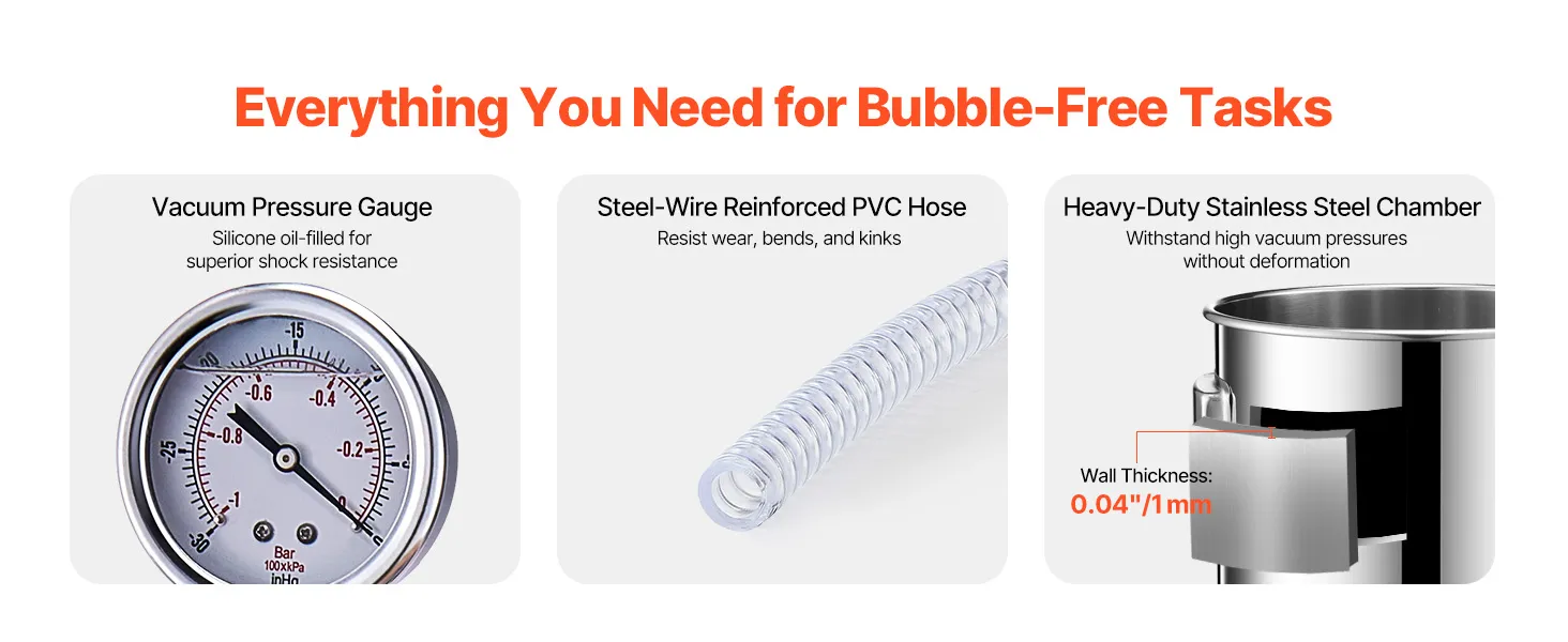 5-Gallon Vacuum Chamber: Crafted from high-quality stainless steel, our vacuum chamber for resin is built to withstand high pressure without warping or deforming. The fully transparent acrylic lid allows you to easily monitor the degassing process, giving you full control over your results.