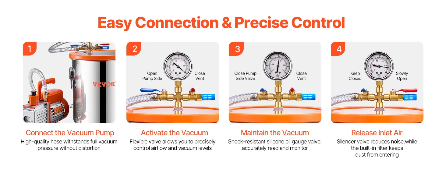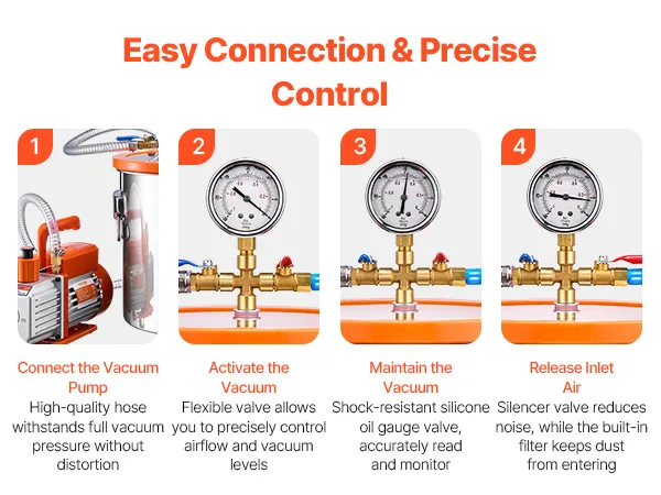 No complicated setup is required. Easily monitor your vacuum level via the silicone oil gauge valve. Quickly connect the valve with a threaded connector, and connect your vacuum pump with a 4.92 ft hose. A silencer valve reduces noise, and the built-in filter keeps dust from entering.