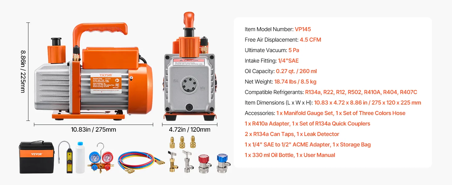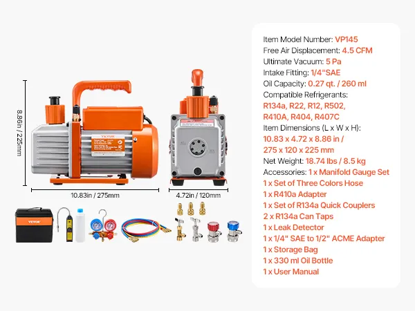 Krachtige en efficiënte vacuümpomp: Aangedreven door een duurzame viertraps puur koperen motor, levert deze 4,5 CFM eentraps vacuümpomp een eindvacuüm van 5 Pa. Met een oliecapaciteit van 0,27 qt. (260 ml), zorgt voor efficiënte en betrouwbare prestaties bij het onderhoud van het koelsysteem.
