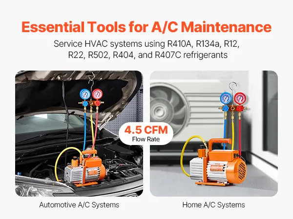 Universele koelmiddelcompatibiliteit: Compatibel met een verscheidenheid aan koelmiddelen, waaronder R134a, R22, R12, R502, R410A, R404A en R407C. Deze AC-vacuümpomp en manometerset is ideaal voor auto-airconditioning, HVAC-onderhoud, koeltaken en industriële toepassingen die hoge vacuümniveaus van een compacte pomp vereisen.