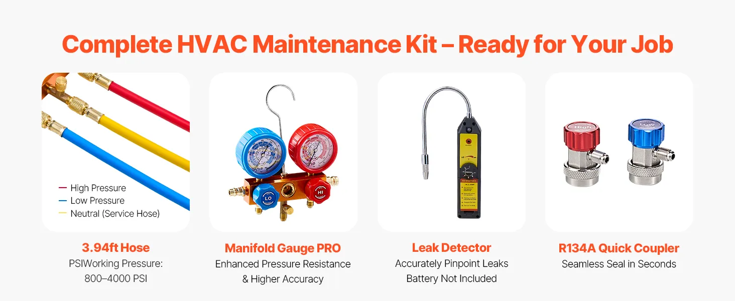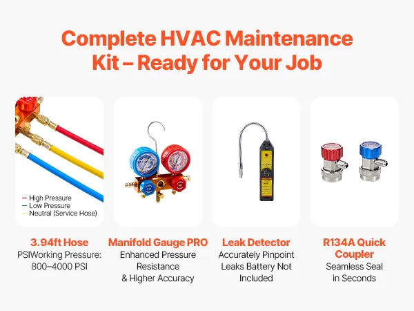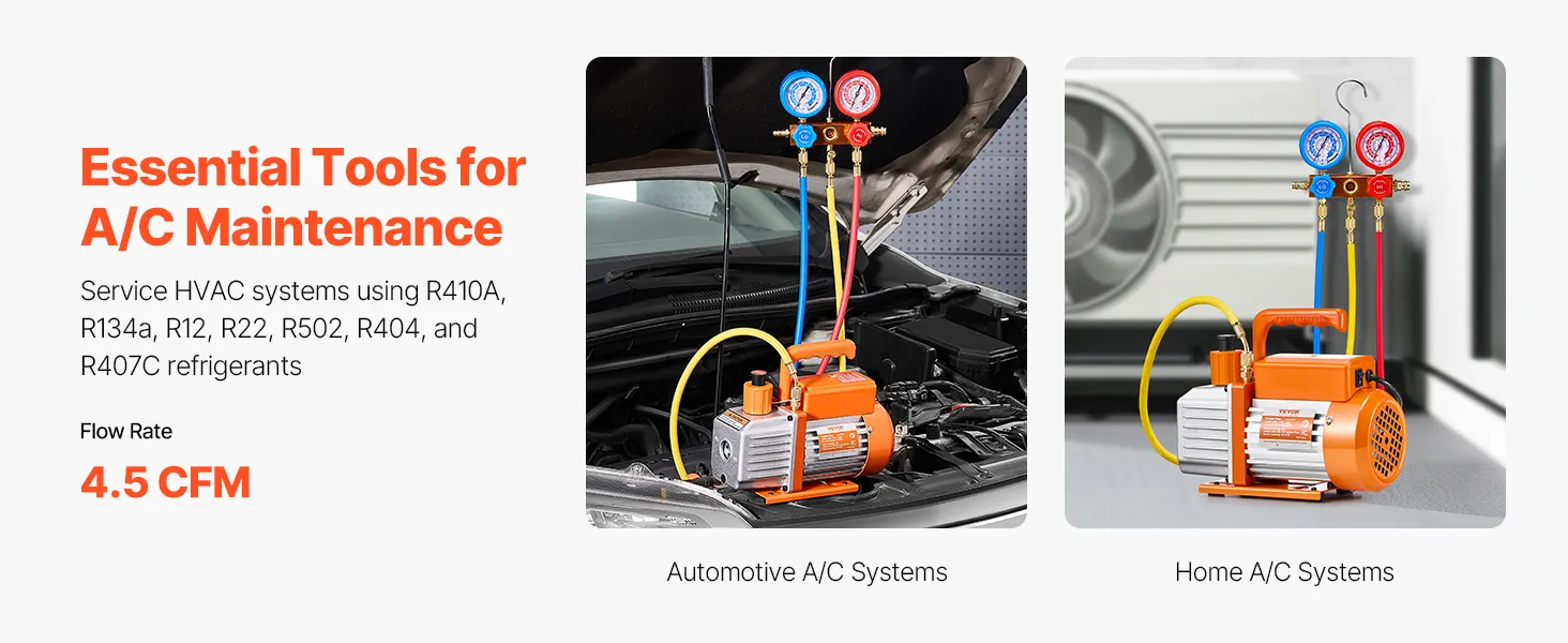 VEVOR 4,5 CFM AC vacuümpomp en meterset, 1-traps HVAC lucht vacuümpomp, A/C koelmiddel verdeelstukmeterset, met lekdetectieslangen, voor R134a, R12, R22, R502a, R410A, R404, R407C