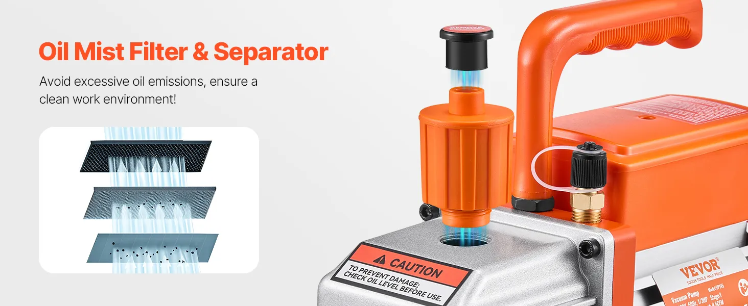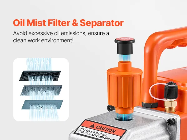 Zeg vaarwel tegen olienevelvervuiling. Het ingebouwde filtersysteem van onze airconditioning-vacuümpomp vermindert de uitstoot van olienevel in de lucht, waardoor een schone en veilige werkomgeving wordt behouden.