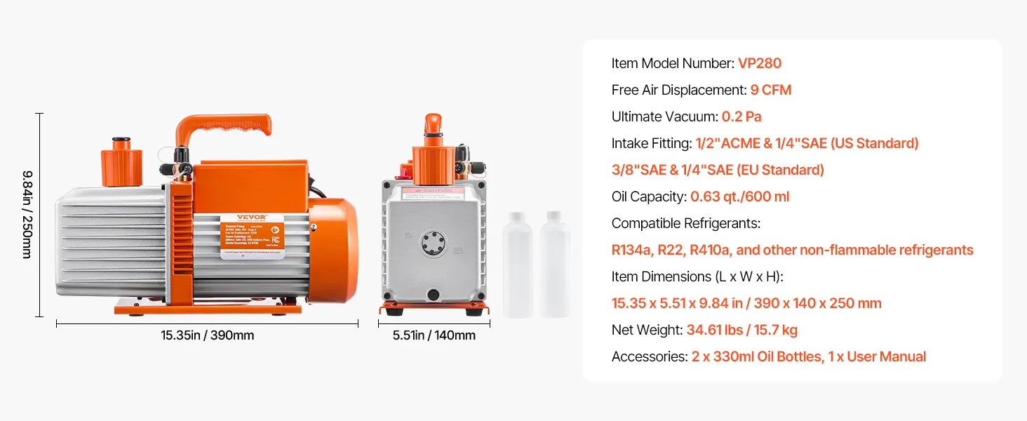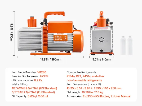 Uitgerust met een puur koperen motor, 1/4" SAE- en 3/8" SAE-connectoren en twee flessen van 330 ml. Vacuümolie repareert gemakkelijk auto- of kleinere HVAC-systemen zoals R22, R134a en R410a.