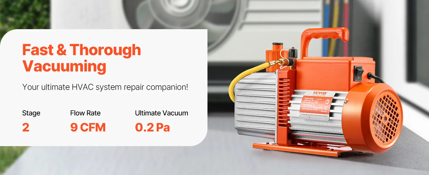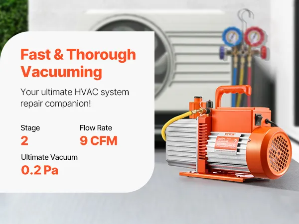 Krachtige prestaties: Met een robuuste puur koperen motor zorgt onze 9 CFM 2-traps draaischuifvacuümpomp voor een snelle, efficiënte evacuatie en bereikt een indrukwekkend eindvacuüm van 0,2 Pa. Het is ideaal voor HVAC-services en zorgt voor een grondige systeemreiniging, zodat u sneller en effectiever kunt werken.