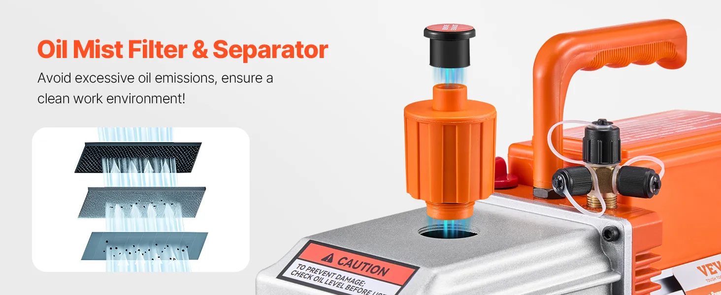 Zeg vaarwel tegen olienevelvervuiling. Het ingebouwde filtersysteem van onze airconditioning-vacuümpomp vermindert de uitstoot van olienevel in de lucht, waardoor een schone en veilige werkomgeving wordt behouden.
