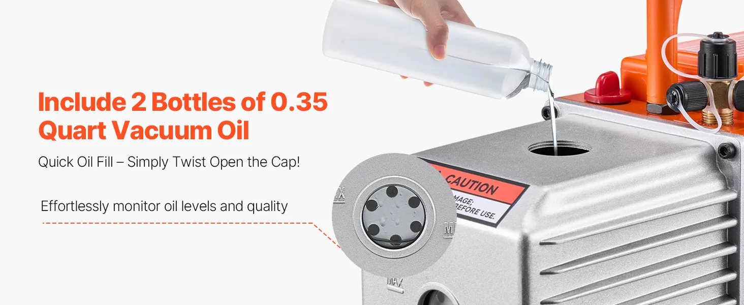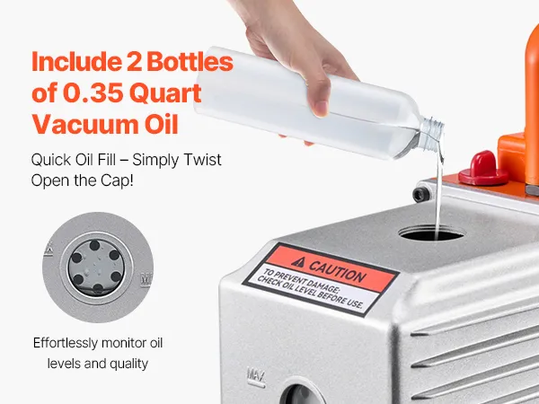 Gebruiksvriendelijk ontwerp: Uitgerust met een oliecapaciteit van 600 ml en een zichtbaar olievenster, is het controleren van het oliepeil nog nooit zo eenvoudig geweest. Je weet altijd wanneer het tijd is om bij te vullen, zodat alles soepel blijft verlopen. We hebben ook twee flessen van 330 ml vacuümolie meegeleverd om u op weg te helpen.