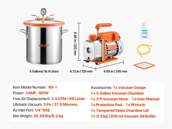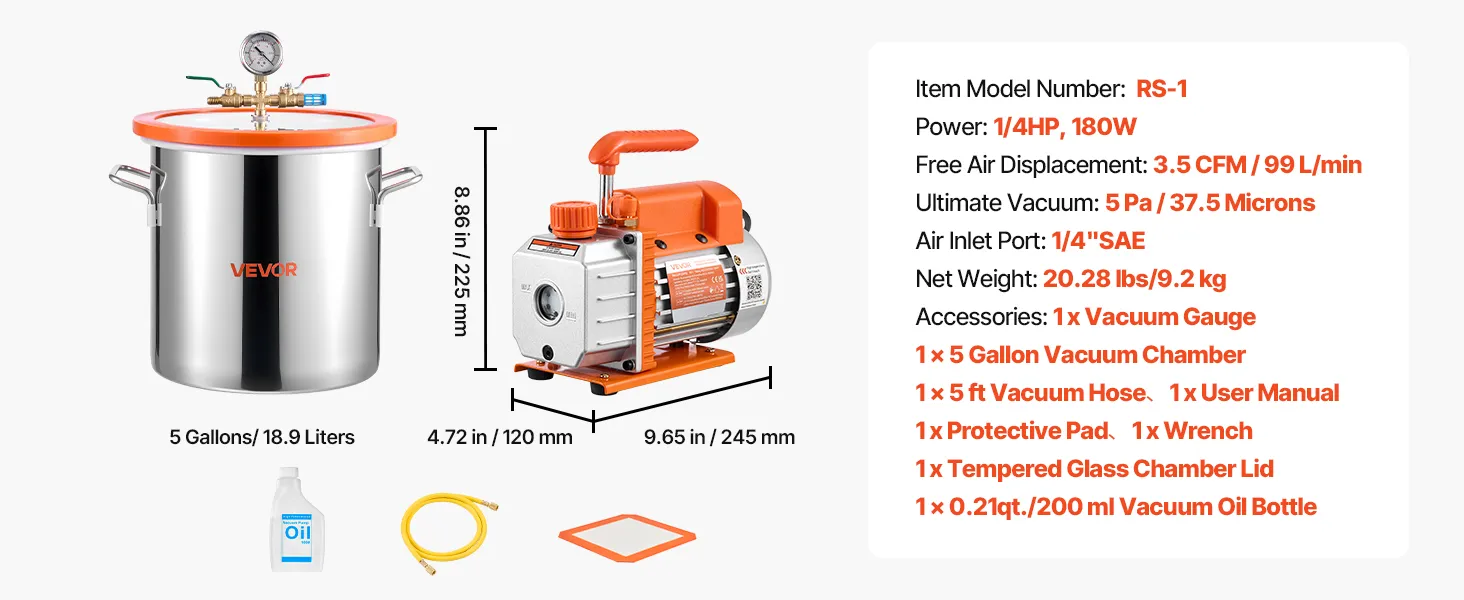 Complete alles-in-één set: alles wat u nodig heeft is inbegrepen: een vacuümpomp, een vacuümkamer van 18,9 liter, een deksel van gehard glas, een vacuümmeter, een slang van 1,5 meter, een beschermmat en een flesje vacuümolie van 200 ml – direct klaar voor gebruik.