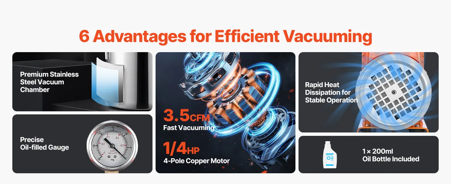 Hoogwaardige ontgassing: Onze vacuümpomp van 99 l/min (3,5 CFM) is ontworpen voor efficiënte ontgassing en luchtafvoer, waarmee een eindvacuüm van 5 Pa wordt bereikt. Ideaal voor laboratoriumtoepassingen, voedselverpakking, harsgieten en houtstabilisatie – hij voldoet aan al uw behoeften.