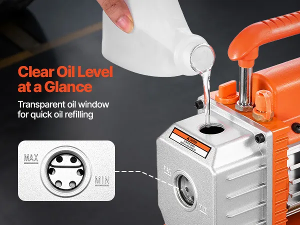 Gebruiksvriendelijk ontwerp: Dankzij de ergonomische rubberen handgreep ligt de pomp comfortabel in de hand. Het transparante oliepeilvenster met markeringen maakt onderhoud eenvoudig – u kunt altijd het oliepeil zien. Dit zorgt ervoor dat uw vacuümpomp probleemloos blijft werken.