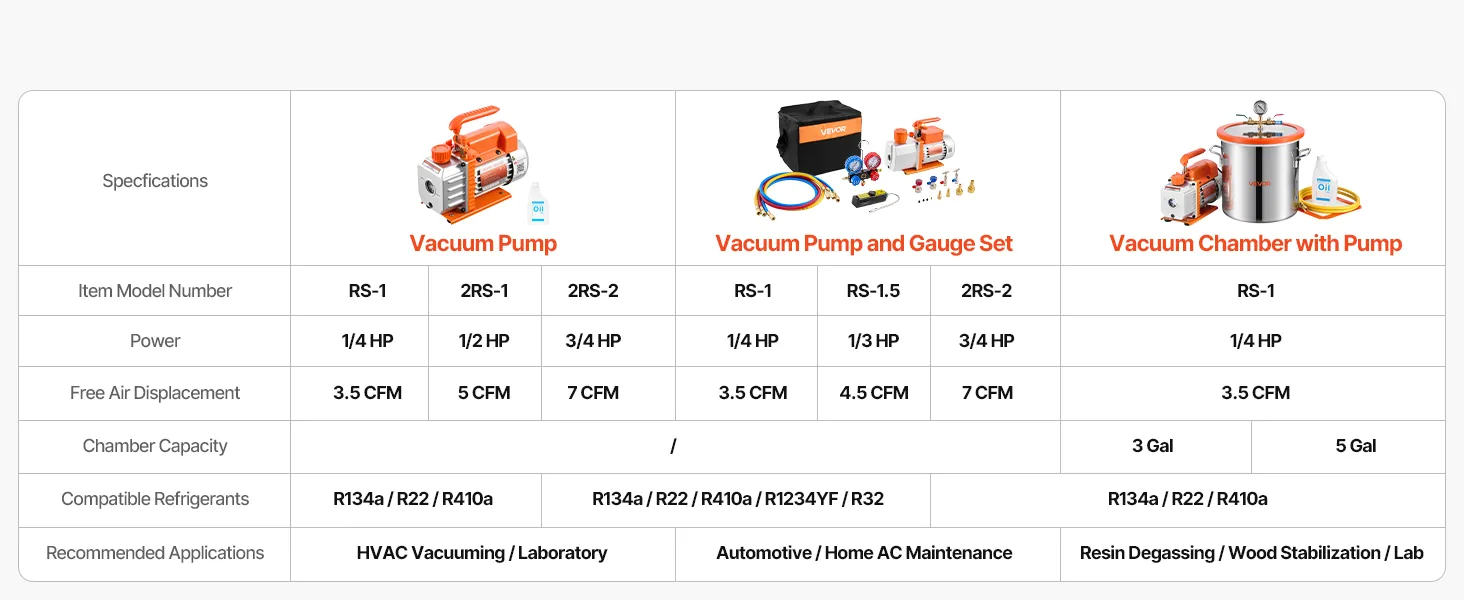 V: Kan deze vacuümpomp voor airconditioners snel een airconditioner in huis stofzuigen? Is de luchtstroom voldoende? A: De pomp is een eentraps roterende schottenpomp met een debiet van 99 l/min (3,5 CFM) en is daarom bij uitstek geschikt voor airconditioningsystemen in woongebouwen. Hij bereikt een vacuüm van < 50 Pa en is geschikt voor de koudemiddelen R134a, R22, R410a, R1234YF, R32 en andere niet-brandbare koudemiddelen.