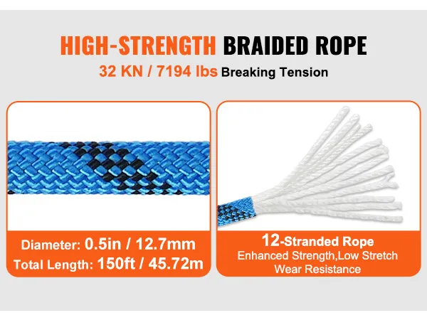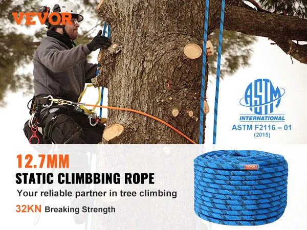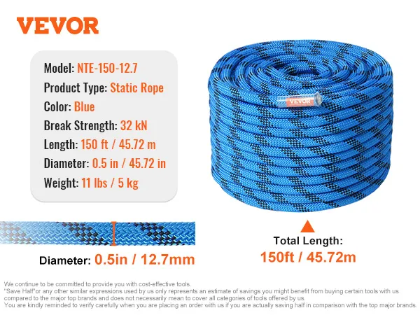 Climbing with Confidence: VEVOR 150ft static climbing rope boasts a durable 0.5'' diameter and a robust 32 kn breaking strength, compliance with ASTM standards, ensuring your fall protection. A perfect addition to any climber's arsenal.