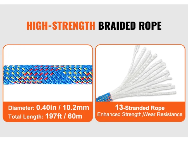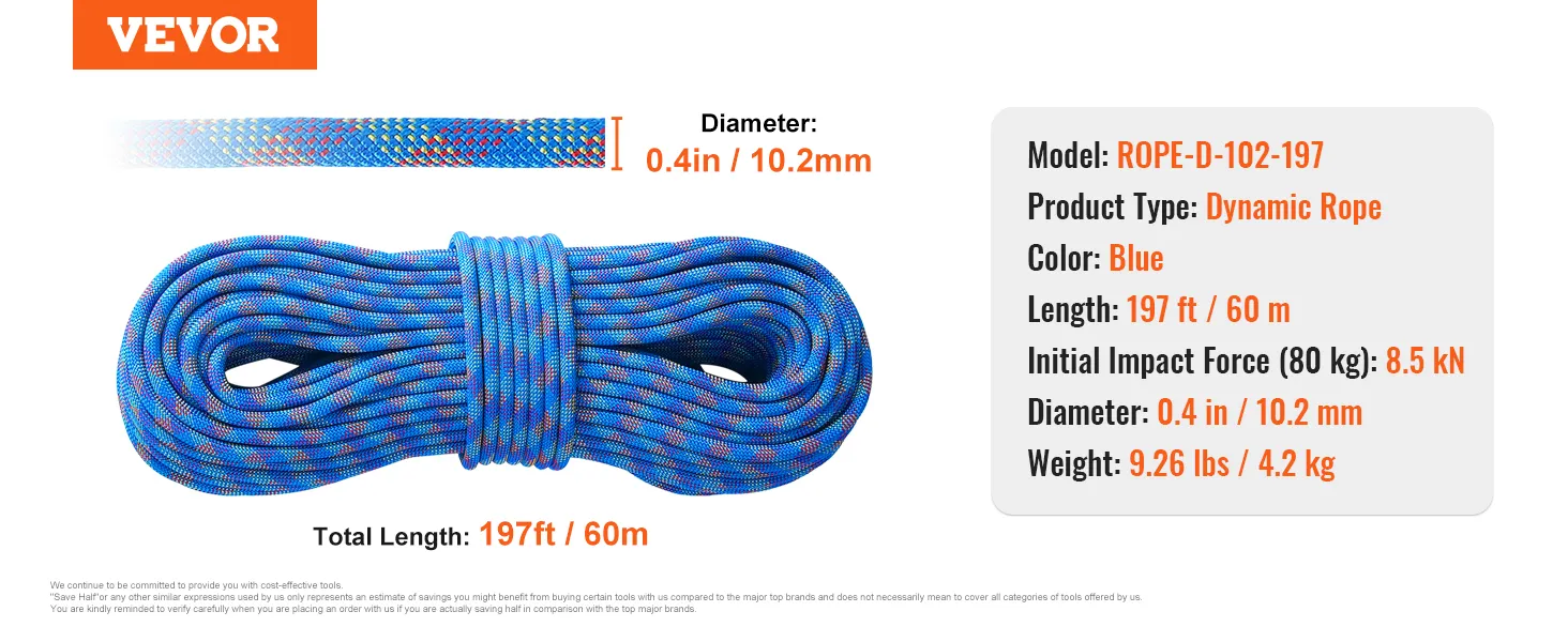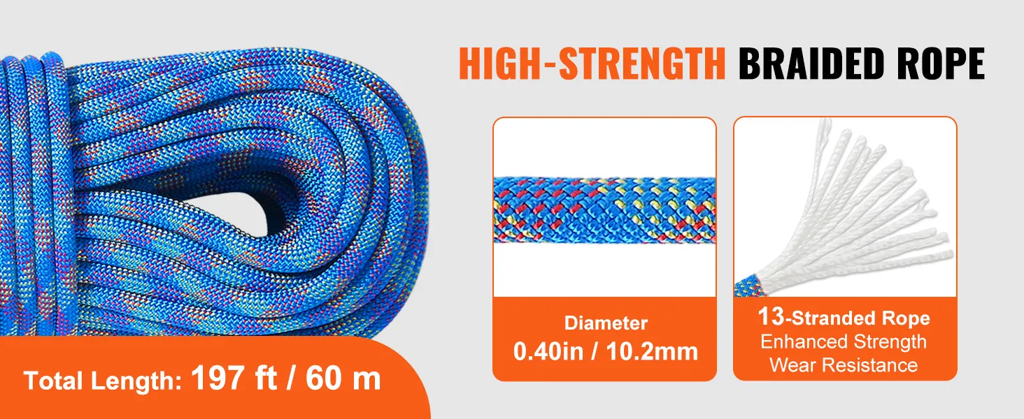 VEVOR 10.2mm Dynamic Climbing Rope, 60M(197ft) Outdoor Rock Climbing Rope 25KN Breaking Tension, Stretchable Fiber Rope with Steel Snap Hooks for Escape, Rappelling, Fire Rescue, Blue VEVOR 10.2mm Dynamic Climbing Rope, 60M(197ft) Outdoor Rock Climbing Rope 25KN Breaking Tension, Stretchable Fiber Rope with Steel Snap Hooks for Escape, Rappelling, Fire Rescue, Blue