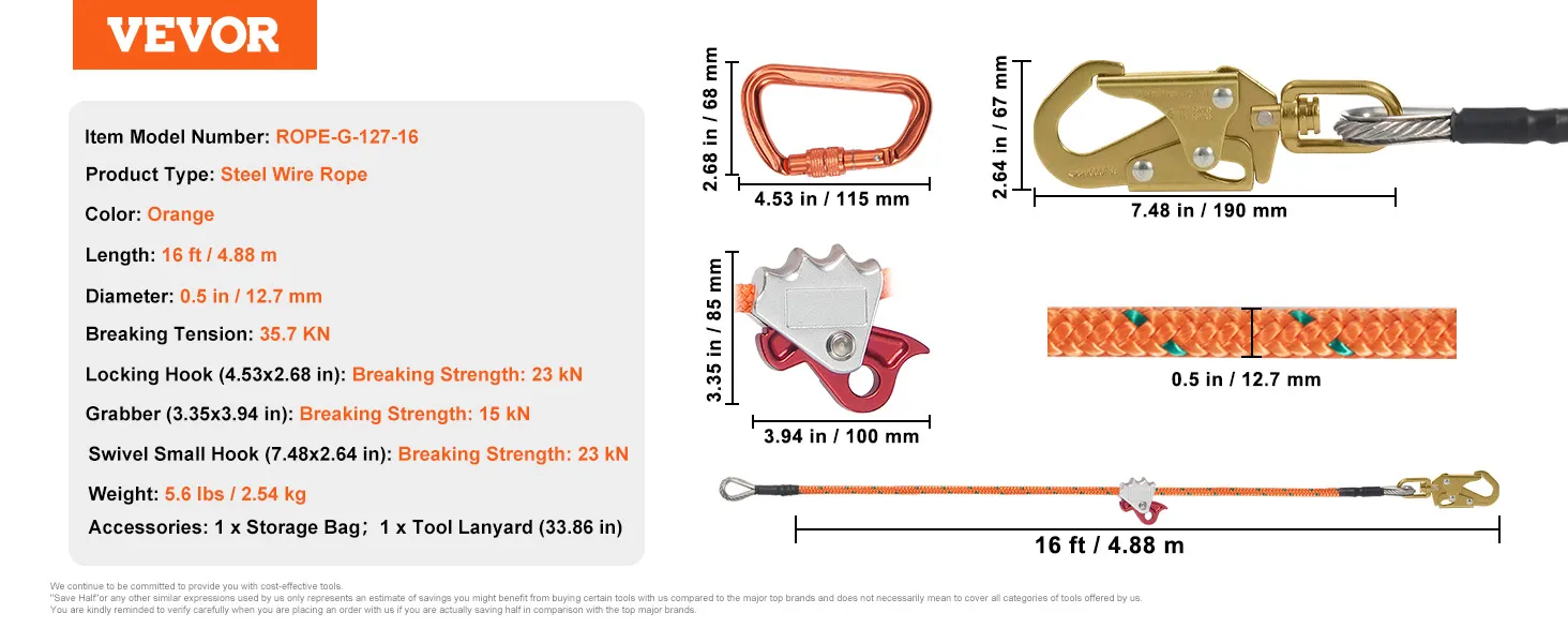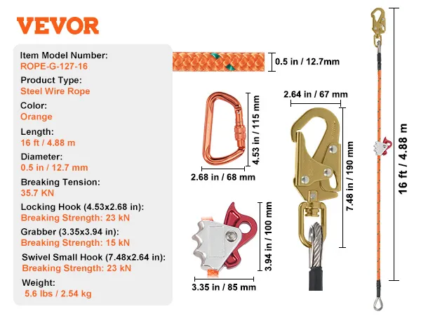 Climb with Confidence: Secure your tree climbing work at heights with the VEVOR 16ft steel-core flipline. This steel rope boasts a durable 0.5'' diameter and a robust 30 kn breaking strength, compliance with ANSI standards, ensuring your fall protection. A must-have tool for tree climbers.