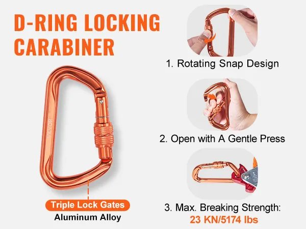 Triple Lock Carabiner: Our carabiner boasts a breaking strength of 23 KN/5174 lbs, providing stability and support during tree climbing. Its strong lock mechanism allows for instant locking and easy one-handed opening. The keylock nose design prevents snagging, while the ergonomic shape ensures a comfortable grip.