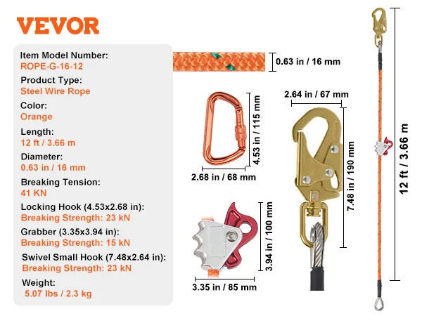 Climb with Confidence: Secure your tree climbing work at heights with the VEVOR 12ft steel-core flipline. This steel rope boasts a durable 0.6'' diameter and a robust 30 kn breaking strength, compliance with ANSI standards, ensuring your fall protection. A must-have tool for tree climbers.