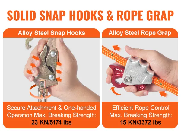 Experience ultimate security with our flip line, equipped with a robust swivel snap hook (23 KN/5174 lbs break strength) for a secure connection to your safety equipment. The aluminum alloy rope grabber (15 KN/3372 lbs break strength) enables seamless movement by easily adjusting the rope.