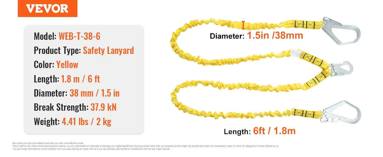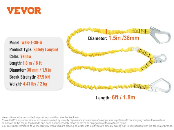 VEVOR 38 mm veiligheidslijn, 1,83 m valbeveiliging met 2 karabijnhaken van gelegeerd staal, intrekbaar veiligheidsharnas voor binnen- en buitenklimmen in bomen, breeksterkte 38 kN, geel