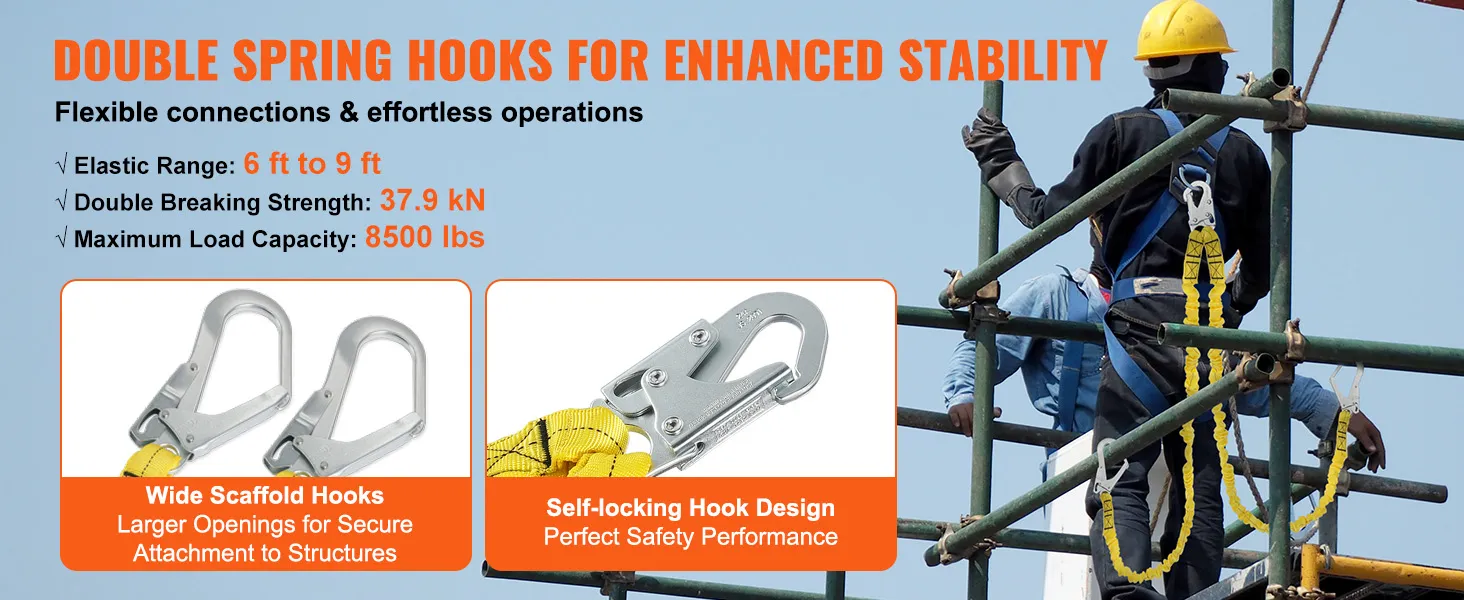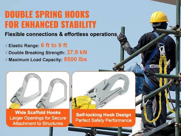 Dubbele veerhaak: Uitgerust met een dubbele veerhaak, heeft de brede steigerhaak een grotere opening voor een eenvoudigere en snellere verbinding met verschillende constructies. De karabijnhaken zijn ontworpen als zelfsluitende haken, waardoor de verbinding stabieler en veiliger wordt en u perfecte veiligheidsprestaties krijgt.