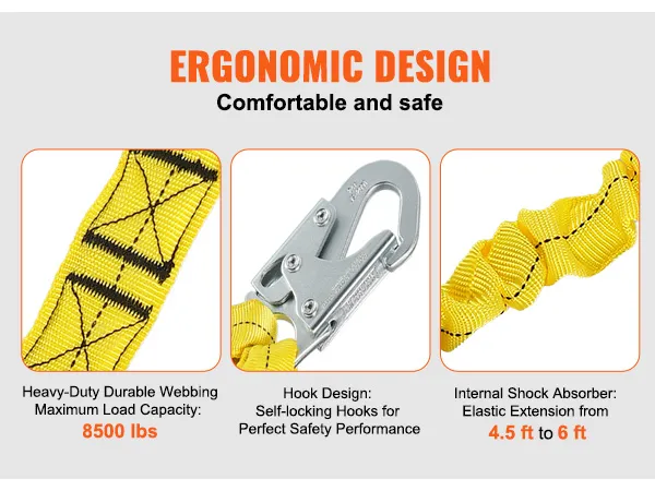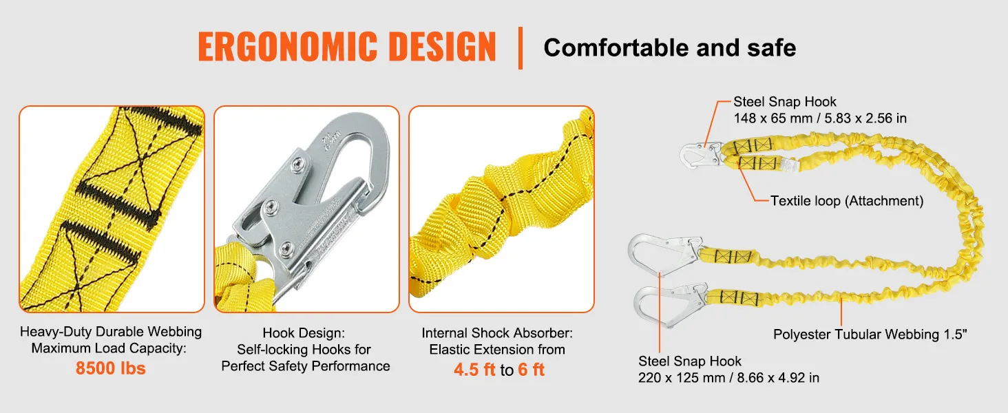 Schokabsorberend ontwerp: het unieke schokabsorberende ontwerp aan de binnenkant vermindert de impactkracht bij een val en maximaliseert uw veiligheid. De elasticiteit varieert van 137 tot 183 cm en is bestand tegen maximaal 2855 kg! Dit betekent dat u zelfs bij een ongeval op hoogte effectief wordt opgevangen en dat de kans op letsel aanzienlijk wordt verminderd.