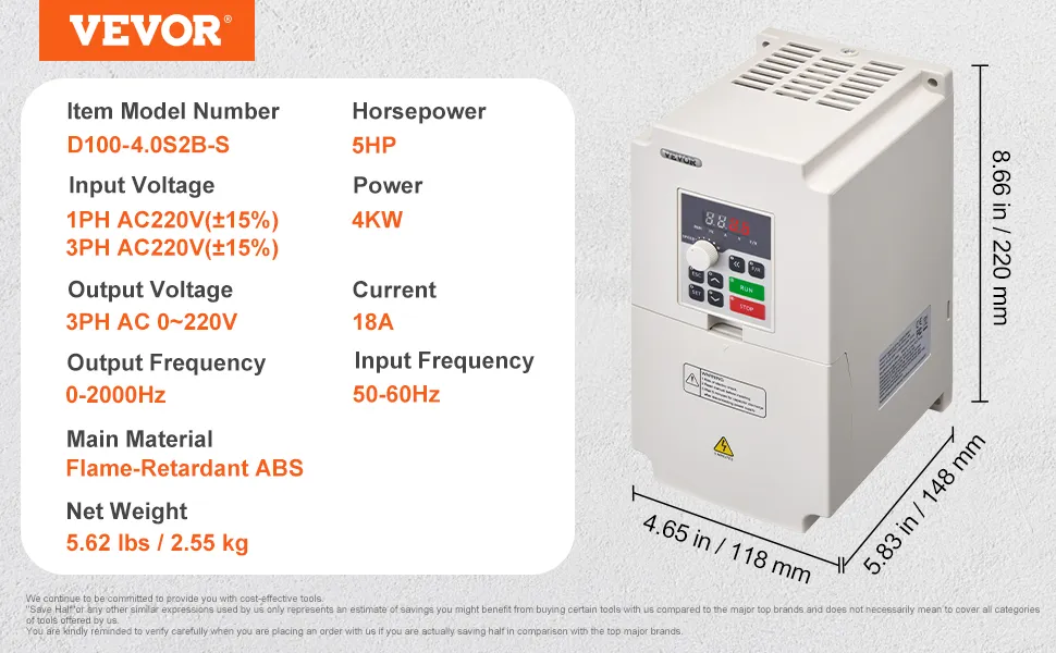 VEVOR Frequentieomvormer VFD 5 pk 4 kW 18 A 1/3 fase AC 220 V ingang naar 3 fase AC 0-220 V uitgang Frequentieomvormer 50/60 Hz ingang 0-2000 Hz uitgang VFD voor spindelmotorsnelheidsregeling