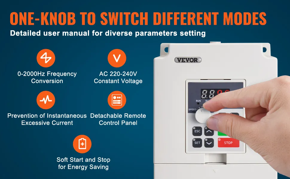 De frequentieomvormer is gebruiksvriendelijk ontworpen en beschikt over een intuïtief display en eenvoudig te gebruiken knoppen voor een snelle start. Het heeft ook een afneembaar bedieningspaneel.