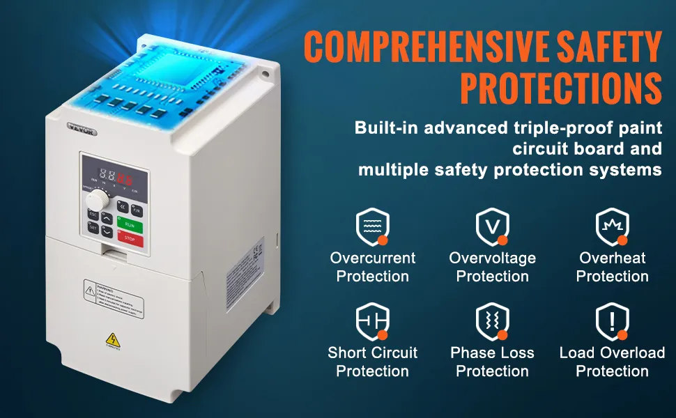 Veilig en duurzaam: de VFD beschikt over een uitgebreid beveiligingssysteem dat bescherming biedt tegen overstroom, overbelasting, overspanning, faseverlies en meer. Deze functies geven prioriteit aan uw veiligheid en verlengen de levensduur van de VFD.