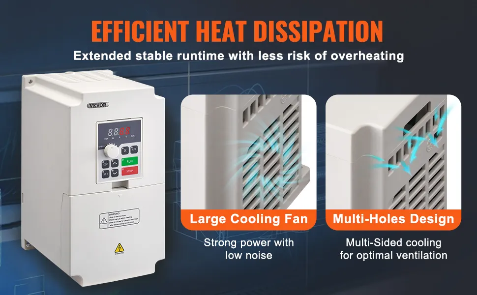 Efficiënte warmteafvoer: Deze VFD beschikt over een krachtige koelventilator en een ontwerp met meerdere gaten, wat zorgt voor een efficiënte warmteafvoer en betere ventilatie. Het biedt stabiele, langdurige prestaties met minder geluid, waardoor het de ideale keuze is voor veeleisende industriële toepassingen.