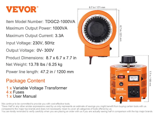 1000 VA variabele transformator: Vermogen: 1000 VA, ingangsspanning: AC 230 V/50 Hz, maximale uitgangsstroom: 3,3 A, uitgangsspanningsbereik: 0-300 V. Voor optimale resultaten raden wij aan een variabele transformator met een vermogen te selecteren van minstens 25% hoger dan de algehele prestaties van uw apparaten. Dit zorgt ervoor dat uw apparaten onder alle omstandigheden soepel werken, waardoor u ongeëvenaarde controle en efficiëntie krijgt.