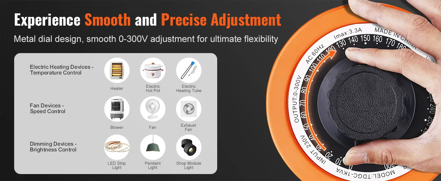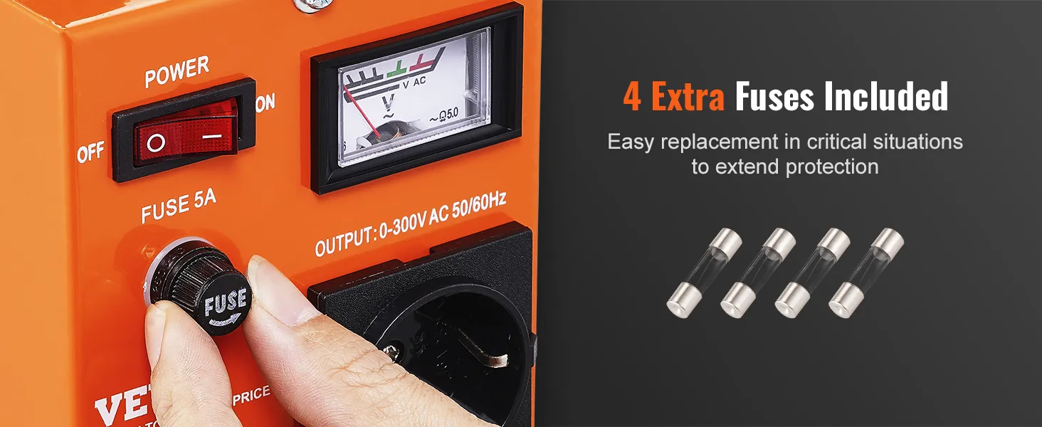 VEVOR 1000VA variabele spanningstransformator, 3,3 ampère, 230 V ingang, 0-300 V uitgang, AC-spanningsregelaar, voeding, met 4 extra zekeringen, voor thuis, industrie en kantoor