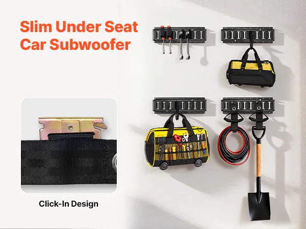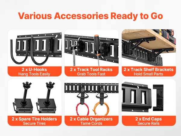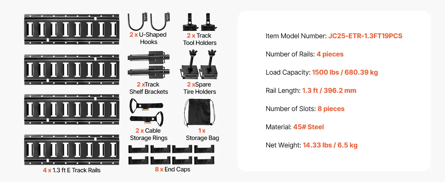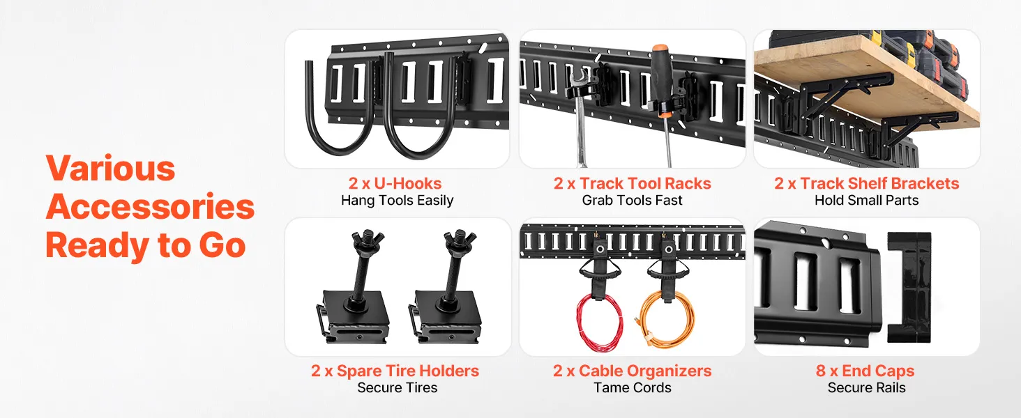Eenvoudige organisatie in de garage en op de werkbank: deze set bevat 2 U-vormige haken, 2 gereedschapshouders, 2 plankdragers, 2 reservewielhouders en 2 kabelringen. Elk onderdeel past op standaard E-rails, zodat u snel een opgeruimd opbergsysteem creëert.