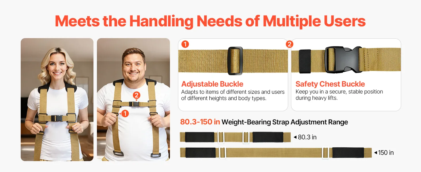 Verstelbaar ontwerp: De meubelliftband heeft een verstelbare schouderband (203-380 cm) die snel te verstellen is met een gesp. Of u nu lang of klein bent, alleen of met anderen werkt, u vindt snel een comfortabele positie.