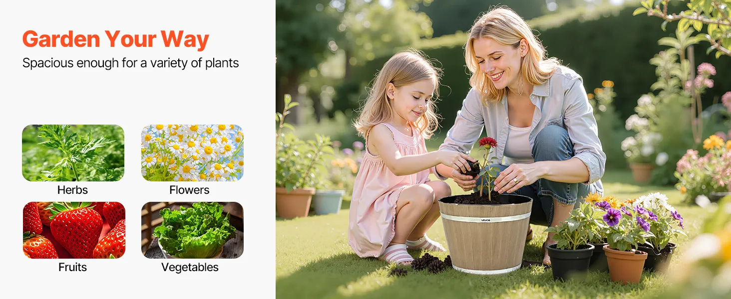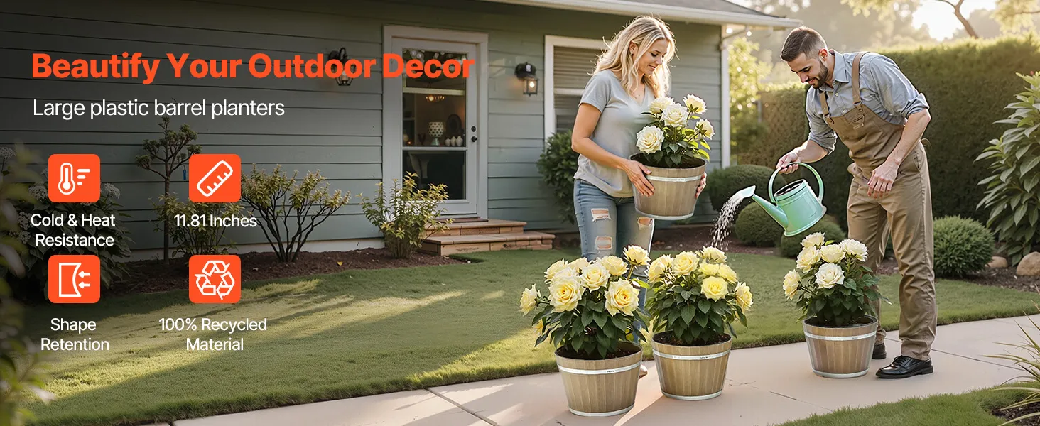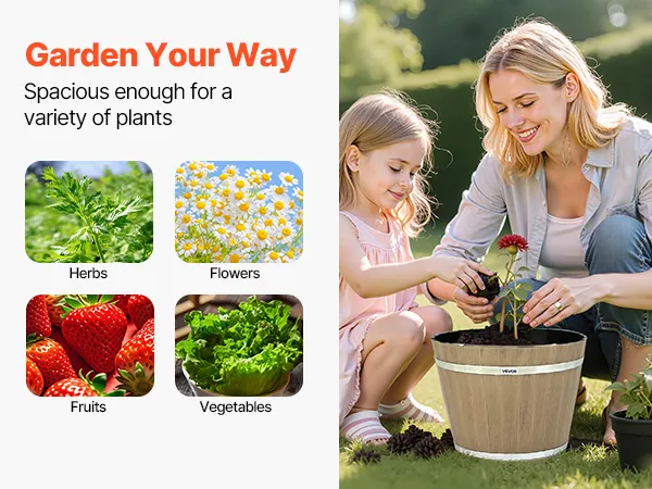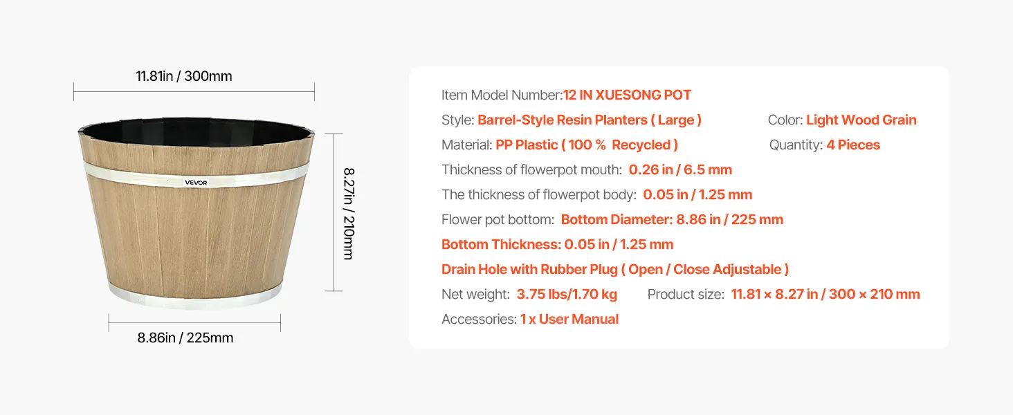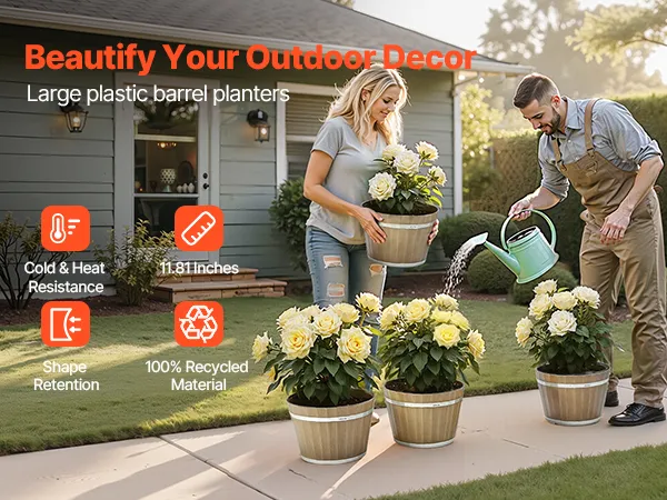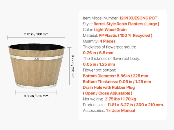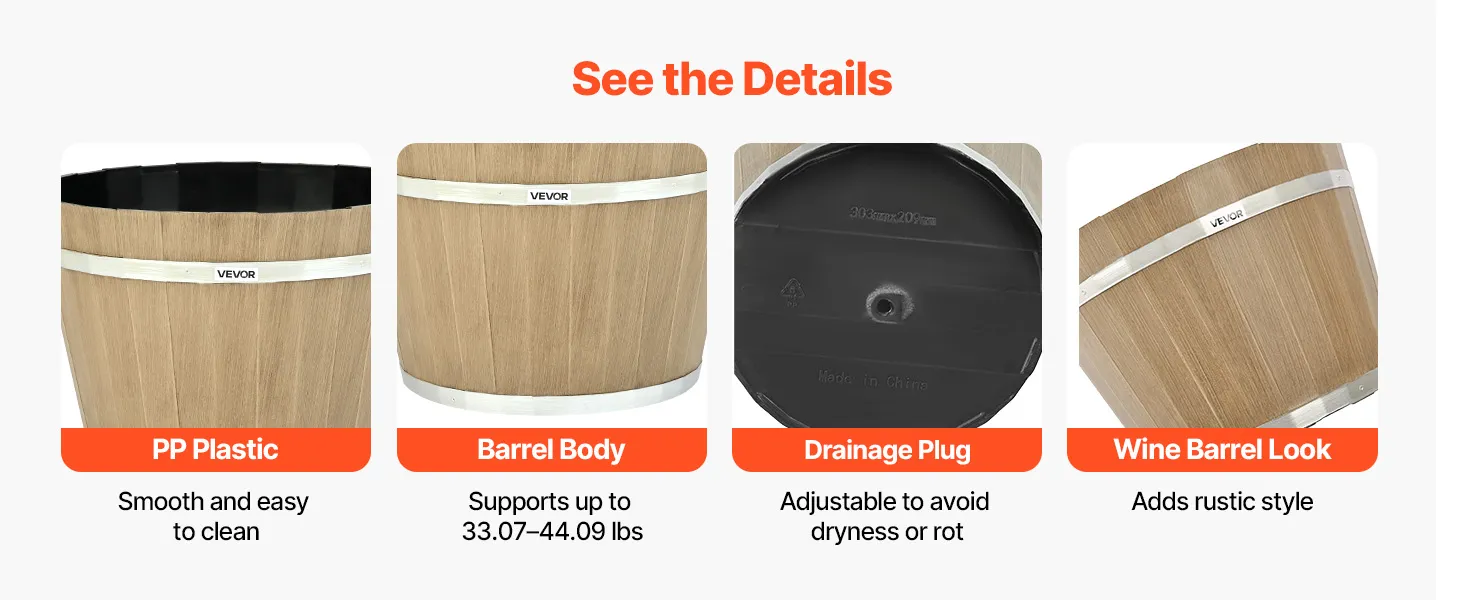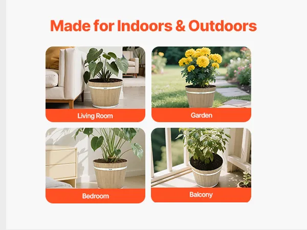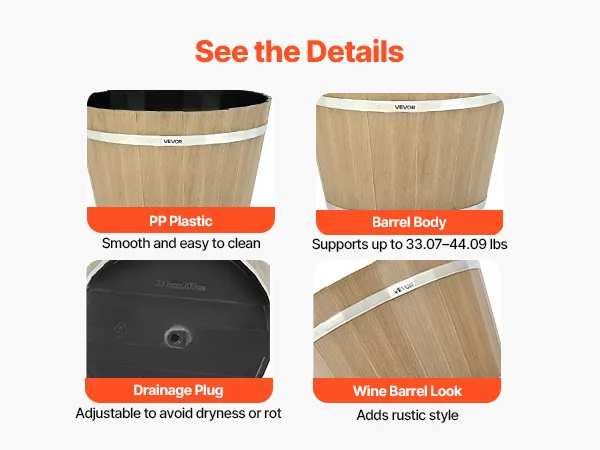 Verstelbare drainageplug: Met de geïntegreerde bodemplug kunt u het drainagegat openen of sluiten voor gebruik binnen en buiten. De grote whiskeyvat plantenbak voor buiten voorkomt wortelrot en droogte, waardoor uw planten een betere omgeving krijgen om te gedijen.