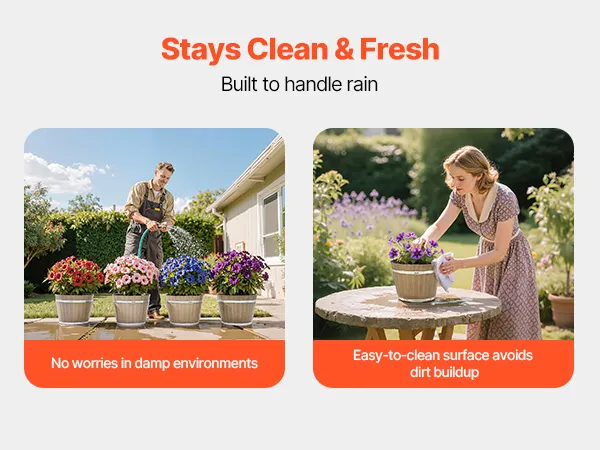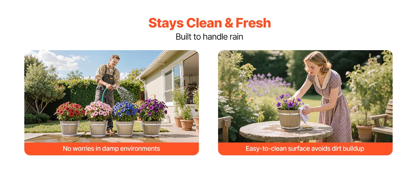 Weerbestendig, duurzaam PP: Deze whiskyvat-plantenbak is gemaakt van 100% PP-kunststof en is bestand tegen zon, regen, barsten en verkleuring. Het gladde oppervlak stoot vuil af, blijft schoon, zelfs bij nat weer, en wordt niet muf – ideaal voor tuiniers van alle niveaus.