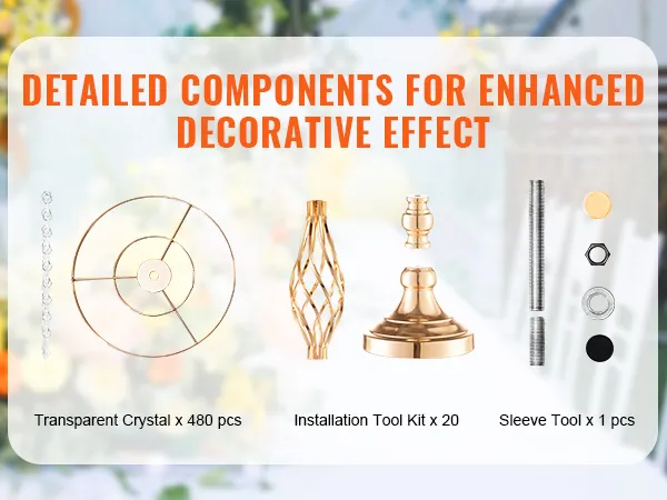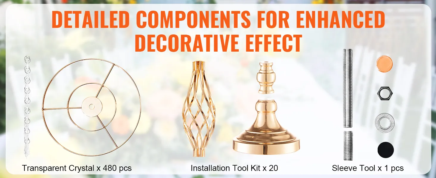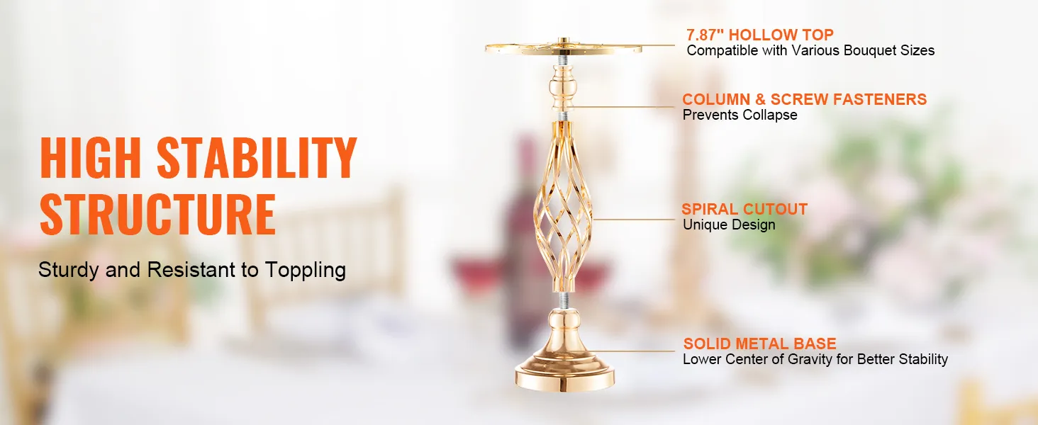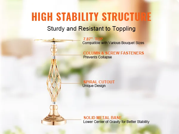 Hoogwaardig materiaal: gemaakt van hoogwaardig koolstofstaal, deze bruiloftsbloemenstandaard is bestand tegen vervorming en duurzaam. Het oppervlak is behandeld met een Frans goudgalvanisatieproces, waardoor een heldere afwerking met levendige kleuren ontstaat die zowel aantrekkelijk als gemakkelijk schoon te maken is. Er wordt gebruik gemaakt van schroefverbindingen om vervorming van de pennen te voorkomen en zo voor meer stabiliteit na montage te zorgen.
