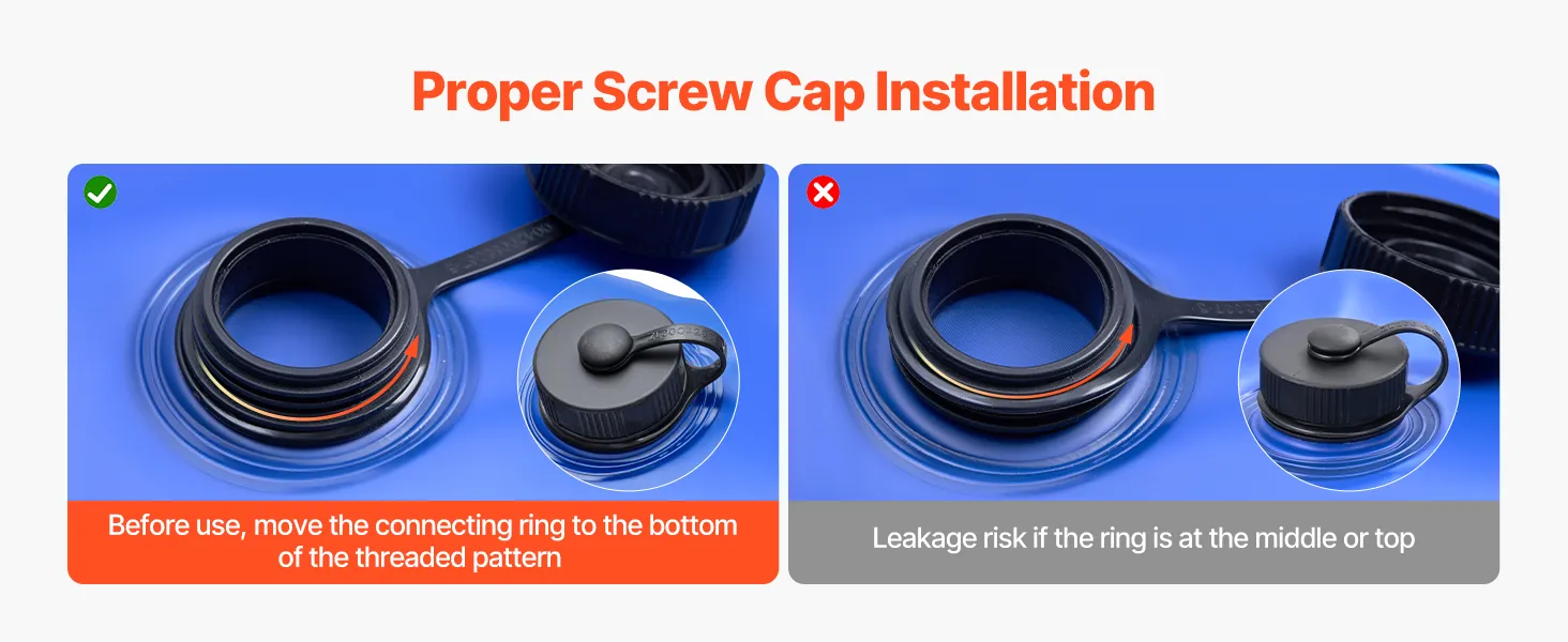 Lekvrije draaisluiting: Elke waterzak is voorzien van een soepele draaisluiting met een geïntegreerde rubberen afdichting voor een goede afsluiting. De antileksluiting houdt de sluiting op zijn plaats, terwijl het verbeterde ontwerp traditionele kliksluitingen overtreft op het gebied van gebruiksgemak en afdichting. Tip: Duw de borgring vóór het vullen helemaal in het spiraalpatroon voor een veilige afsluiting.