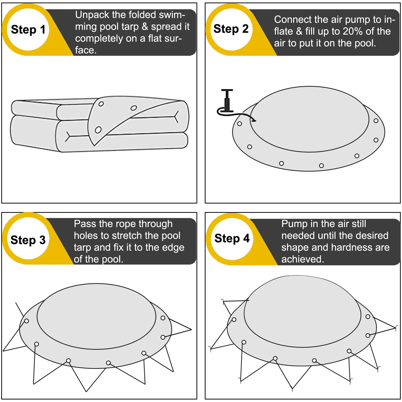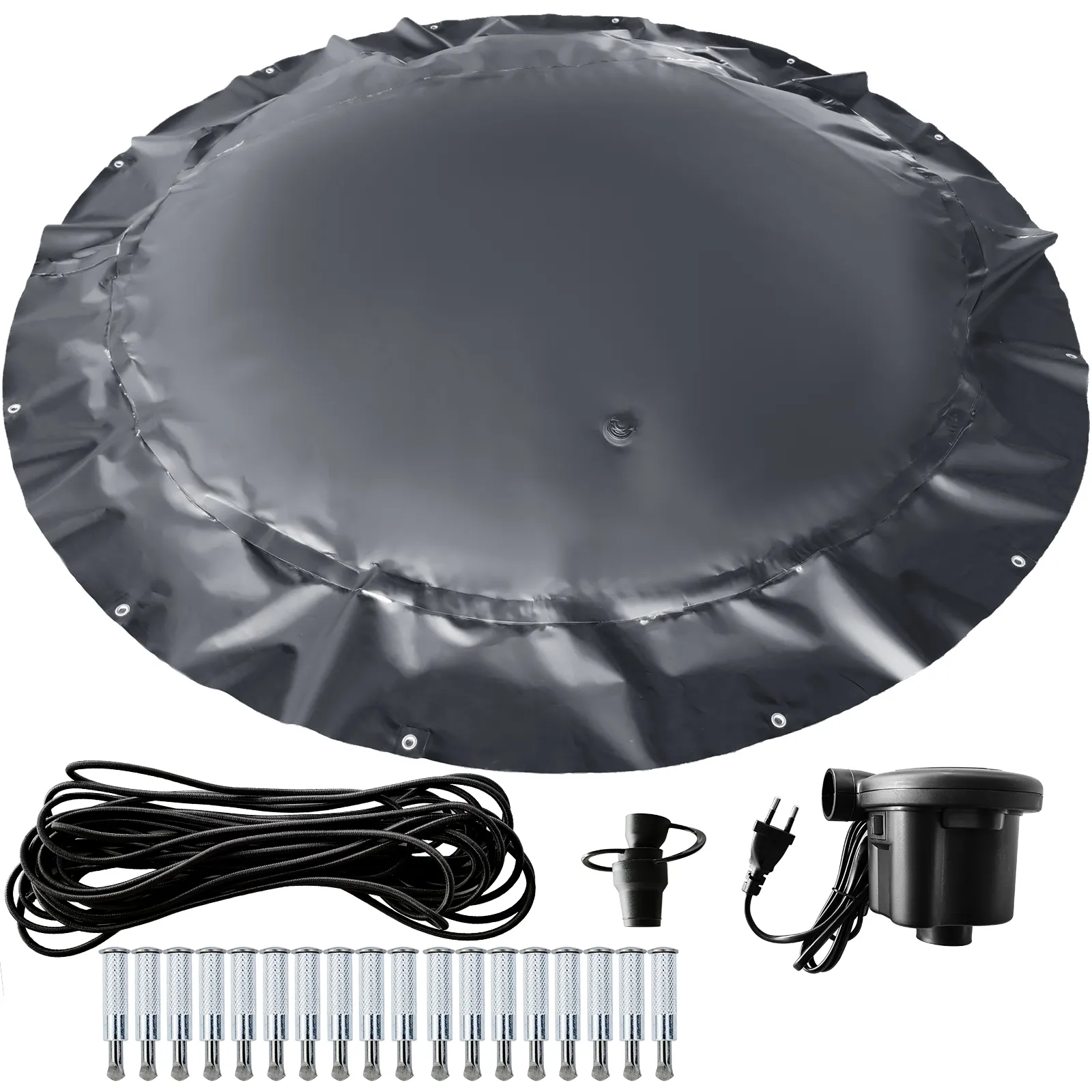 De veiligheidsafdekking voor het zwembad kan worden opgerold en opgevouwen wanneer deze niet wordt gebruikt. Tijdens gebruik wordt de zwembadafdekking strak getrokken met stabiele touwen en schroeven. De elektrische luchtpomp is inbegrepen voor eenvoudige installatie.