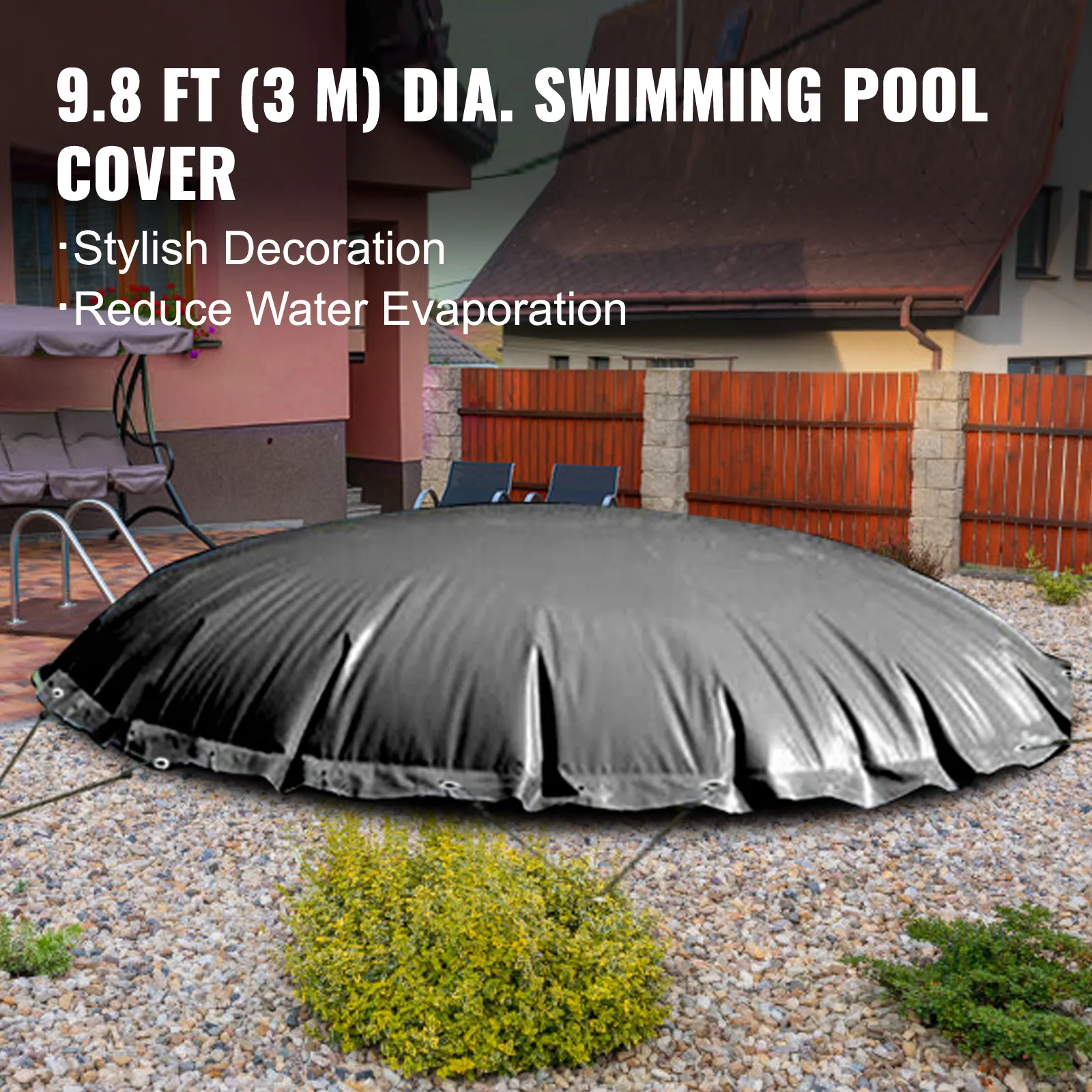 De ingegraven zwembadafdekking heeft een diameter van 9,8 ft, geschikt voor een diameter van 9,7 ft zwembad. Er zijn roestvrijstalen ronde oogjes van 18 mm / 0,7 inch en deze worden rondom elke 19,7" / 50 cm geïnstalleerd.