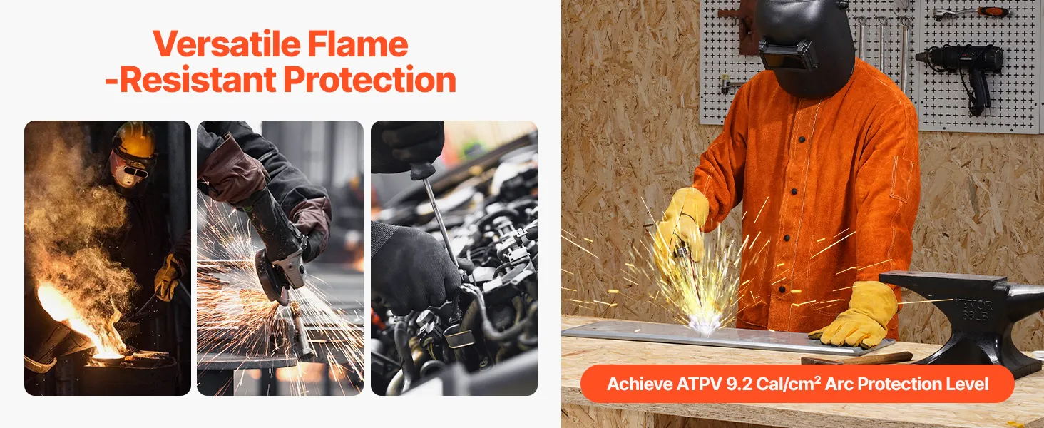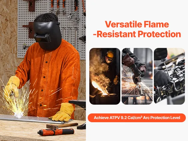 This versatile flame-resistant leather welding jacket offers exceptional protection, achieving an ATPV 9.2 Cal/cm² arc protection level, effectively resisting high temperatures and flames.