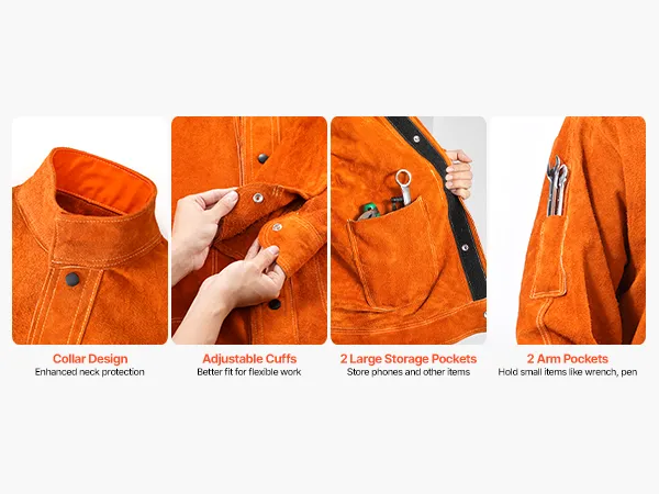 • Thoughtful Designs: This heat-resistant leather welding jacket comes with 2 spacious pockets and 2 arm pockets, ideal for holding tools, mobile phones, or other essentials. Keep your necessities within easy reach, enhancing convenience and improving work efficiency.