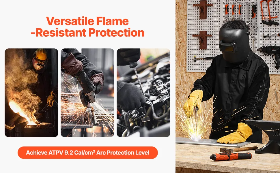 Uitstekende vlamvertraging: onze lasjas is gemaakt van duurzaam rundsplitleer en vlamvertragend puur katoen (9 oz). De mouwen van runderleer beschermen je tegen vonken en vlammen, en het vlamvertragende katoen op de borst en rug zorgt voor comfort en ademend vermogen. Het voldoet aan de ATPV-boogclassificatie van 9,2 Cal/cm² voor veiliger lassen.