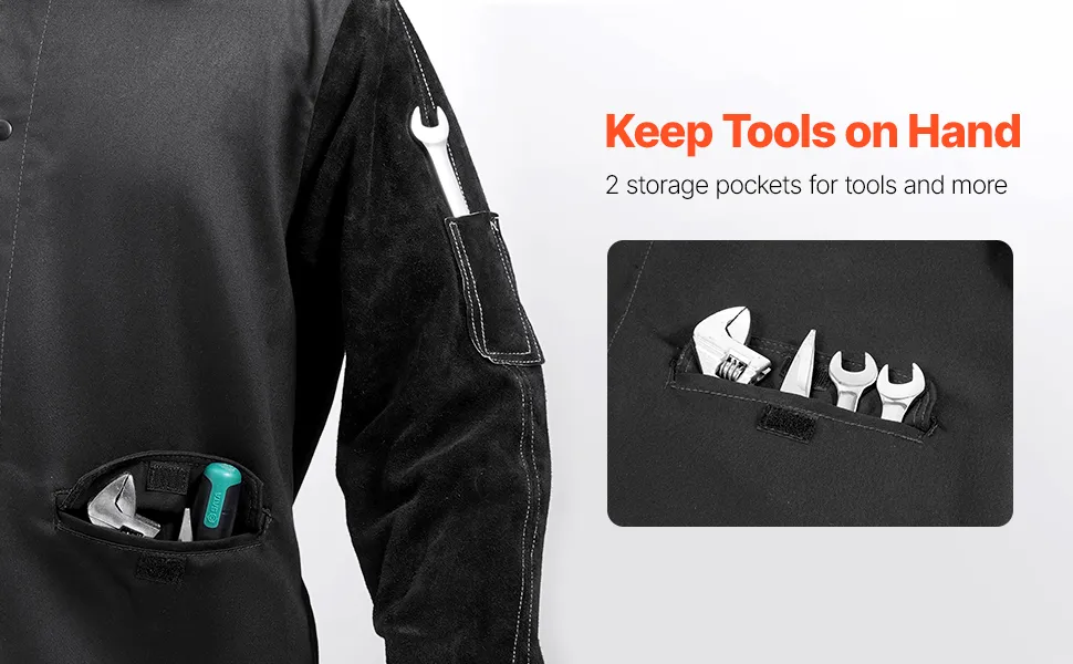 Doordacht ontwerp: deze hittebestendige lasjas heeft 2 zakken die ideaal zijn voor klein gereedschap, mobiele telefoons of andere essentiële spullen. Zo heeft u altijd alles wat u nodig hebt bij de hand. Dit verhoogt uw comfort en verbetert uw werkefficiëntie.
