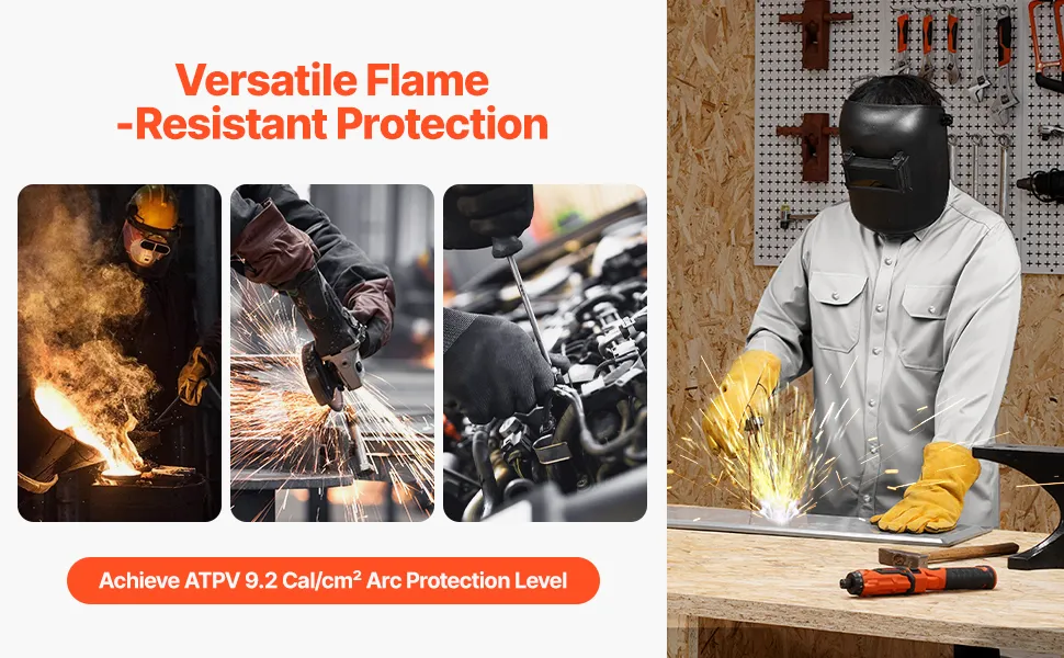 200 gram FR puur katoen: Onze lasjas is gemaakt van 7 oz. Gemaakt van stevig, vlamvertragend puur katoen en voldoet aan de ATPV-boogclassificatie van 9,2 Cal/cm² om u te beschermen tegen vonken, vlammen en brandgevaar. Het biedt uitstekende thermische isolatie, ademend vermogen en comfort, wat zorgt voor veilig en efficiënt lassen
